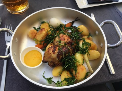 Decent roasted Cornish game Jen with potatoes and a carrot.