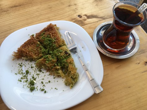 We stopped for dessert at a tiny little shop that sold only desserts. We tried the pistachio Kadayif with Turkish tea. It was really delicious – full of pistachios and generously drizzled with honey. It reminded us of Frosted Miniwheats with honey and pistachios 😊👍🏻