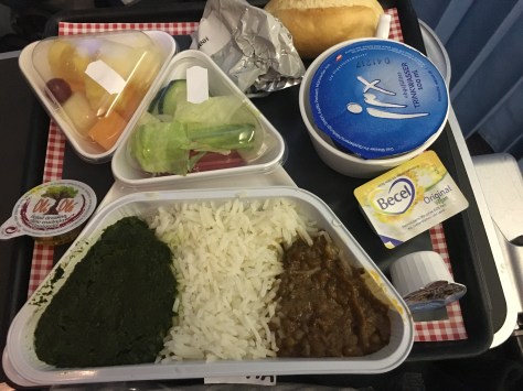 Surprisingly good food- Indian Palaak, basmati rice, and lentils- spicy and flavorful!