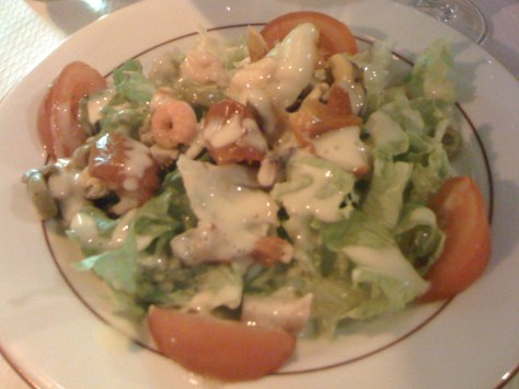 Charity and I ordered the same first course for the menu we got at this not-so-great Italian restaurant. We were with a group of Cyrille’s friends, and they picked the Italian place situated right next to the amazing looking French restaurant, (the Italian place was much cheaper). Sometimes it just doesn’t work out for everyone when you’re in a big group, oh well. This salad was pretty bad. Bad lettuce, bad tomatoes, very bad unidentifiable seafood, and a poorly flavored vinaigrette.