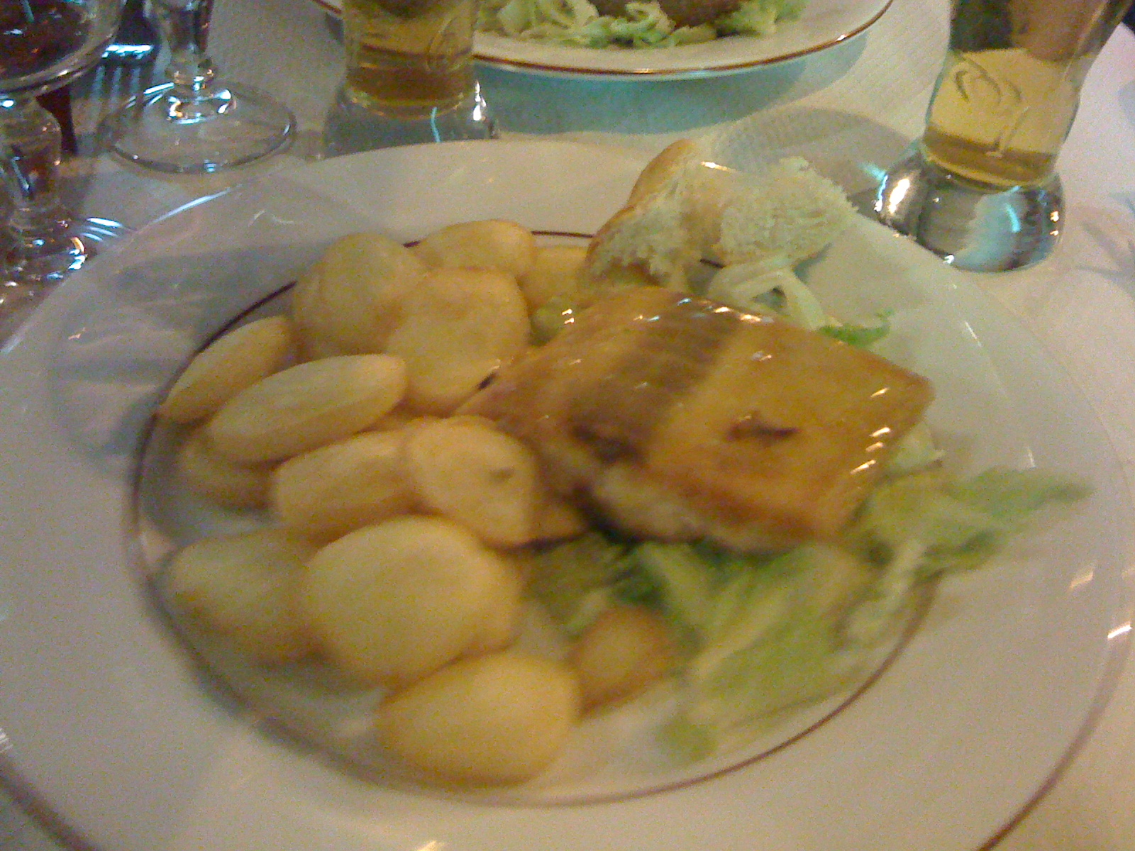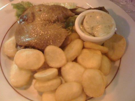 This was Charity’s main course. It was pretty bad. The salmon was atop some iceberg lettuce that would’ve fit perfectly in any side salad at any American diner. The sauce covering the salmon was equally bad and reminiscent of England’s salad cream. Yuck. But, those frites were pretty good.