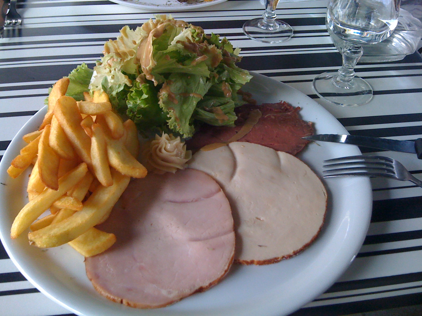 Sliced ham, turkey, and beef with salad and frites, Bourges, France