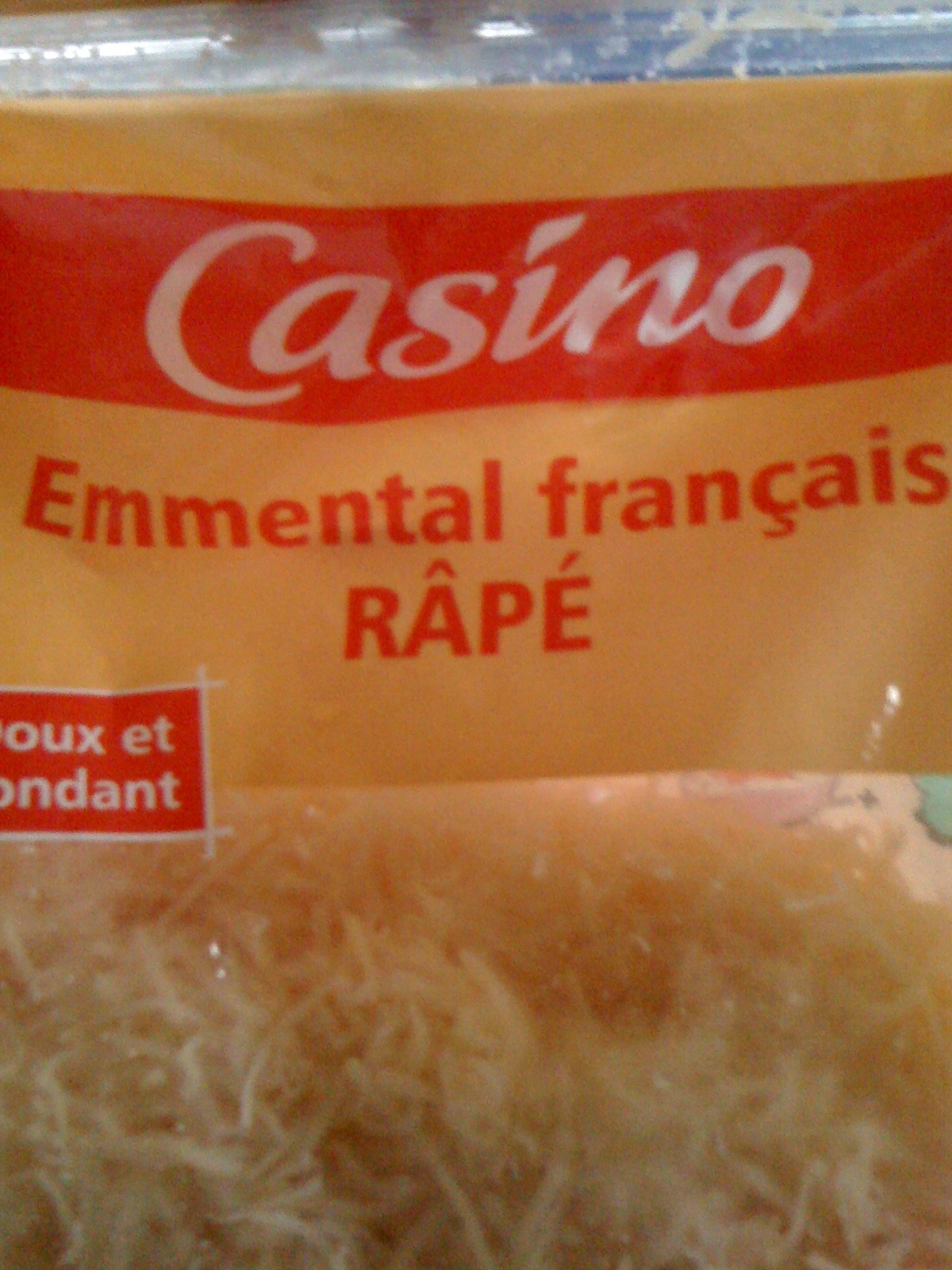 Charline’s prepared this tasty pasta dish for us, even after working all day at the bank. She was so nice to us! The pasta was al dente, the sauce was sweet and savory with small chunks of ham. It was pretty good. The cheese we topped it with, by the double handful, was the standard everyday cheddar-like emmental. But this was the first time we noticed what it says on the bag. Cue the laugh track.