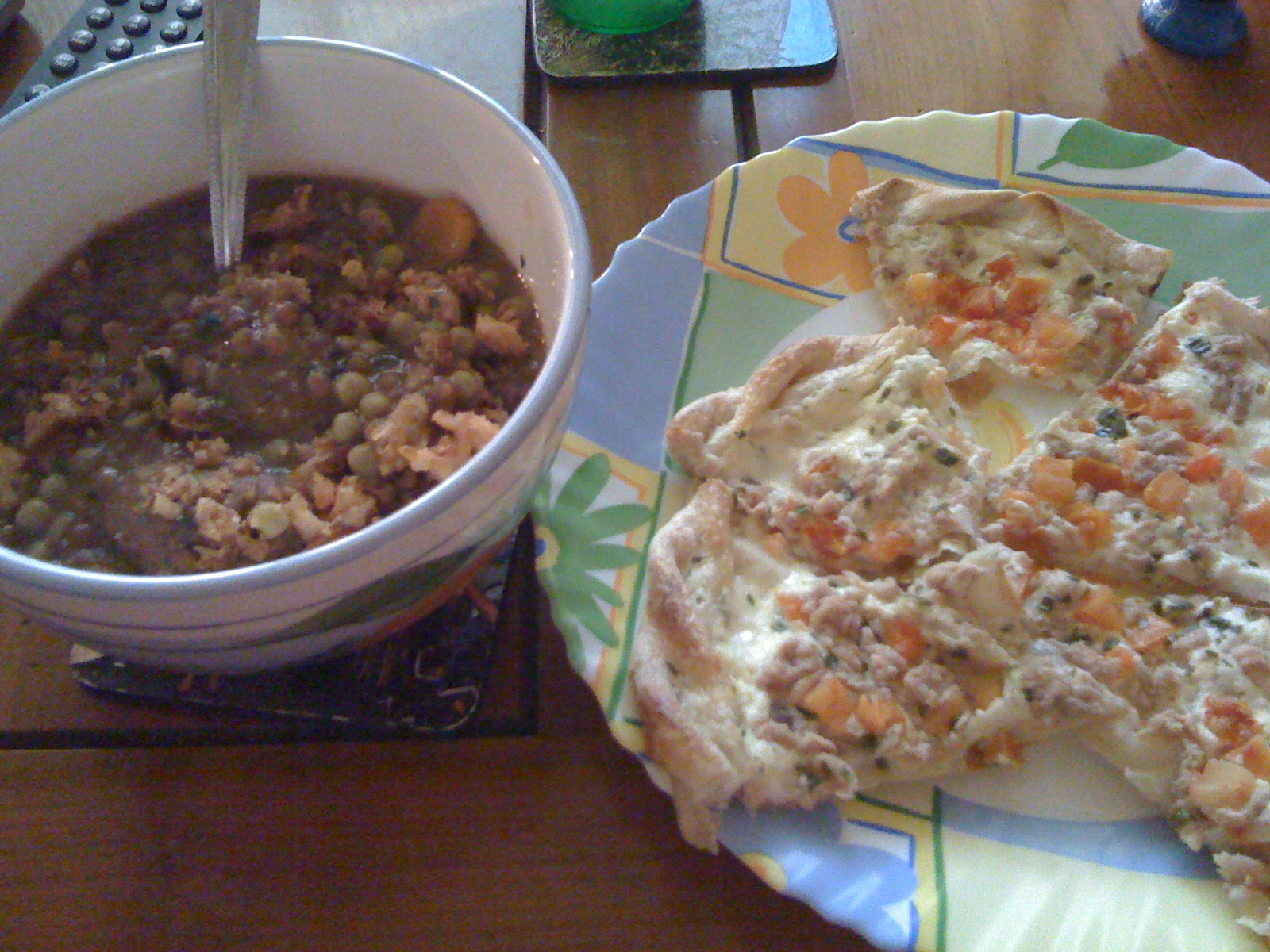 Everything-out-of-a-can stew with frozen tuna pizza, Cyrille's father's apartment, Rodez, France