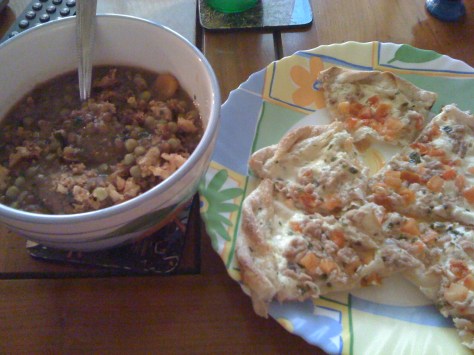 My magic chef wife did it again, she made food out of nothing! We had a pretty decent stew consisting of only canned ingredients. Sandra Lee would’ve been proud. While its hard to say exactly what went into the stew, I do know for sure that it had lentils, chicken dumplings, and red wine. I thought it was pretty good but Charity disagreed. We do agree on the pizza though, it was dreadful. Tuna and an ominous white sauce on a pizza crust with shriveled up and yellowed tomato cubes. Wow. When’s breakfast?