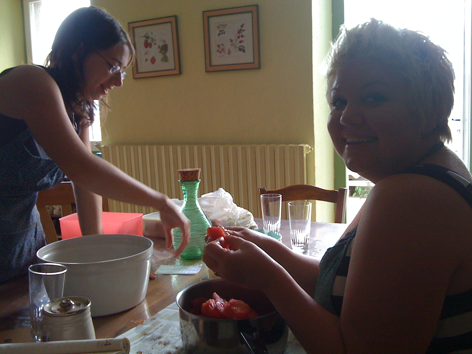Amélie’s mother is waving to us from the kitchen window, Amélie and her cousin are on the terrace where we ate dinner.