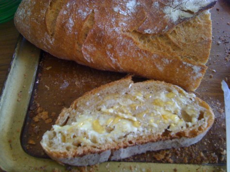 Crusty bread with butter and honey, Amélie's family country house, Rodez, France