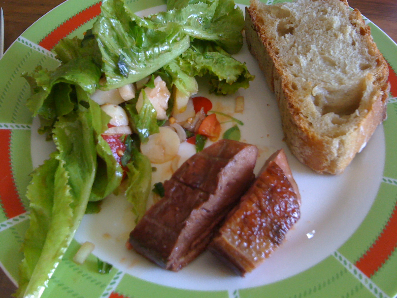 Grilled duck breast with salad and bread, Amélie's family country house, Rodez, France