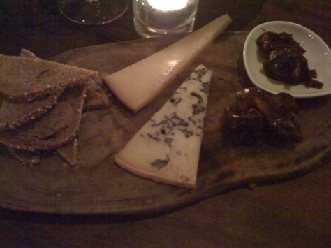 Whoa baby this was good! By this point in the meal, we were stuffed, but we had just enough room for some stinky cheese and thinly sliced honey-wheat bread. There were two cheeses, a pleasantly stinky Roquefort and a lovely aged English Cheddar, served with a sweet and spicy apple cinnamon chutney and succulent Madjool dried dates. The waiter suggested a complex Bordeaux to complement all the cheesy, fruity goodness- Heaven!