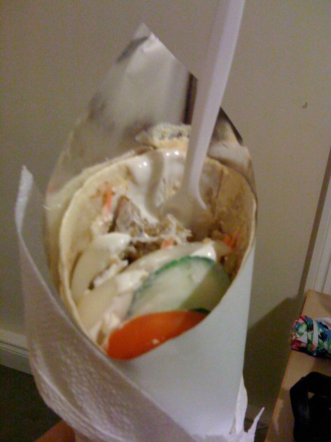 Donner kebab with onions, cucumber, and tomato, Mehdi's kebab truck, Oxford, UKCharity wanted to experience the glory that is Mehdi’s kebab truck, so we shared a kebab as we were still full from all the Indian food. The donner meat was very tasty, as always, and the veg was okay. The garlic mayonnaise pulled it all together, but the pita was less than amazing, it was just a plain old pocket bread like we have back home. I’ll stick to chips and cheese from the truck I think, much better results.