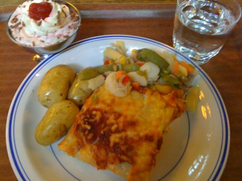 Lasagne with stuff that used to be veg, Oriel College dining hall, Oxford, UKLasagne, I think? This was so bad, I’m having a hard time finding the right words to describe it properly. Especially the veg, I ate it strictly for the microscopic shreds of nutritional value that was still hanging on after hours of being cooked. Simply disgusting.