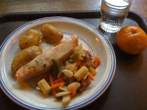 Salmon with veg and potatoes, Oriel College dining hall, Oxford, UKCharity’s salmon was not much better than my lasagne. The veg was the same, simply disgusting. This was an all-time low for the college dining hall. I will not miss meals like this one.