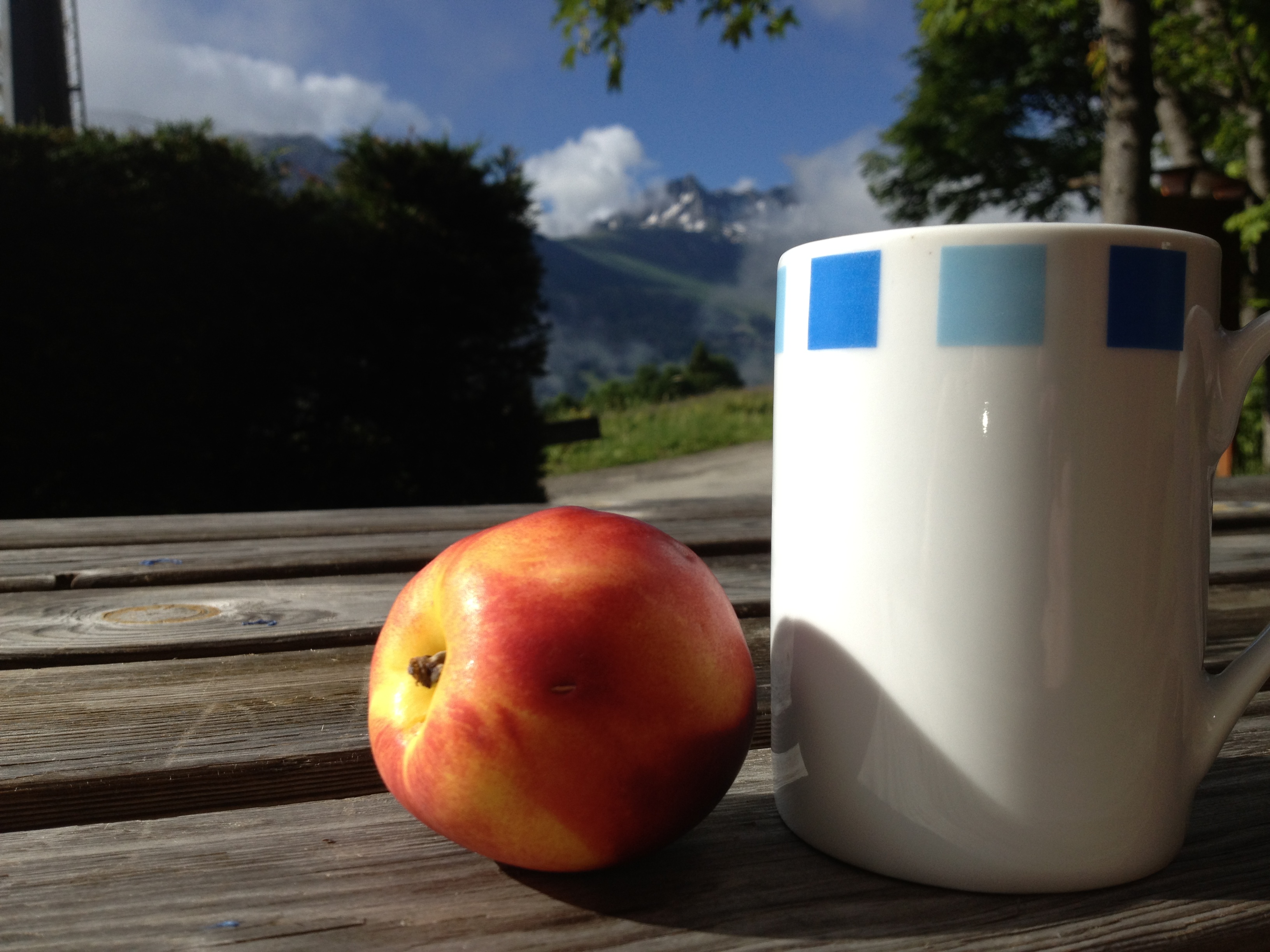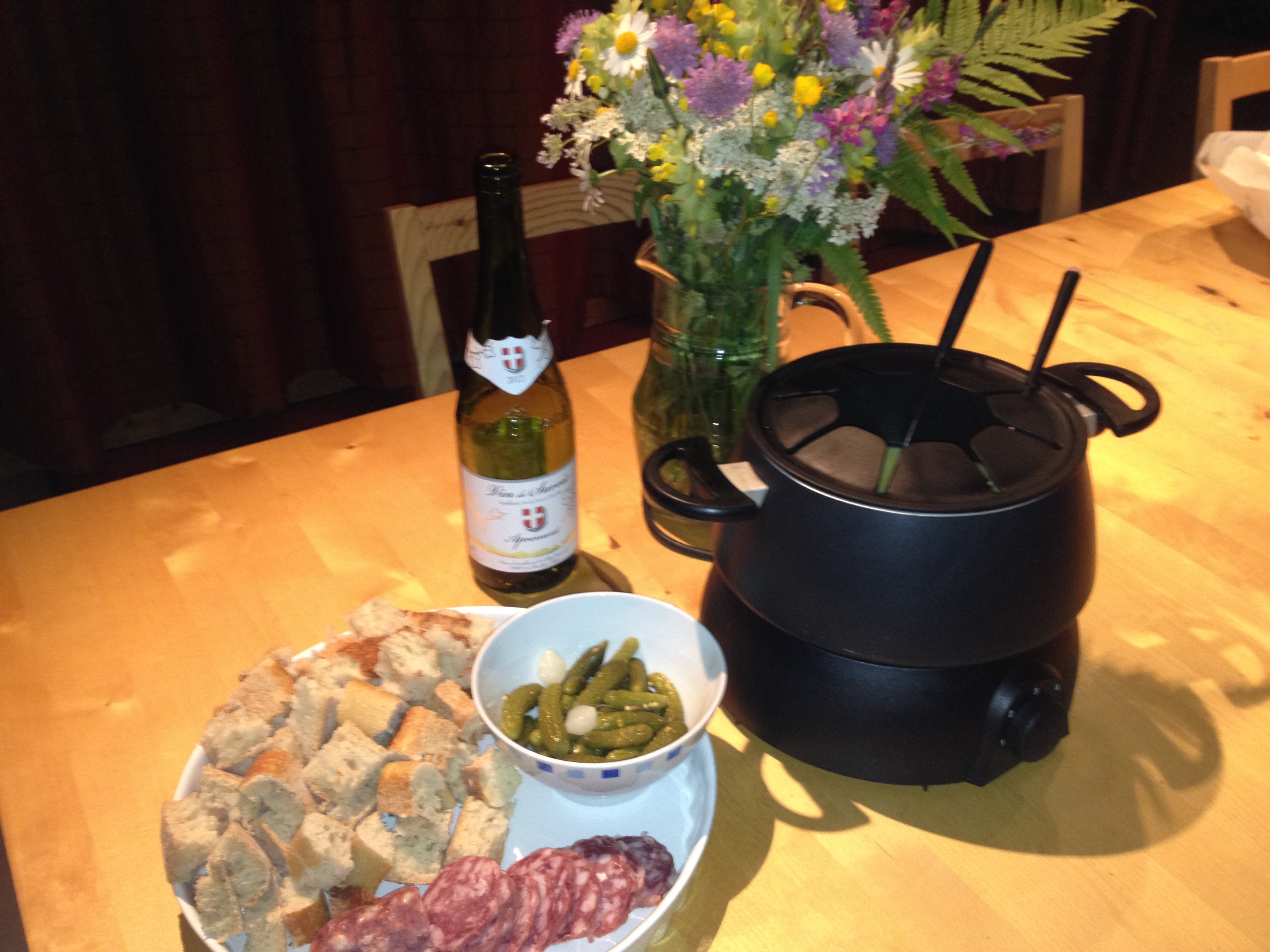 After the white knuckle drive up the mountain I was in no mood to prepare a full meal. I kept it simple. I put some cornichon in a bowl, cut up some bread and sausage, and melted some local cheeses (Beaufort, Emmental, Gruyere) with wine (Apremont), Kirsch, and mustard. Voila! Super fatty, tasty, melty fondu dinner! ๐