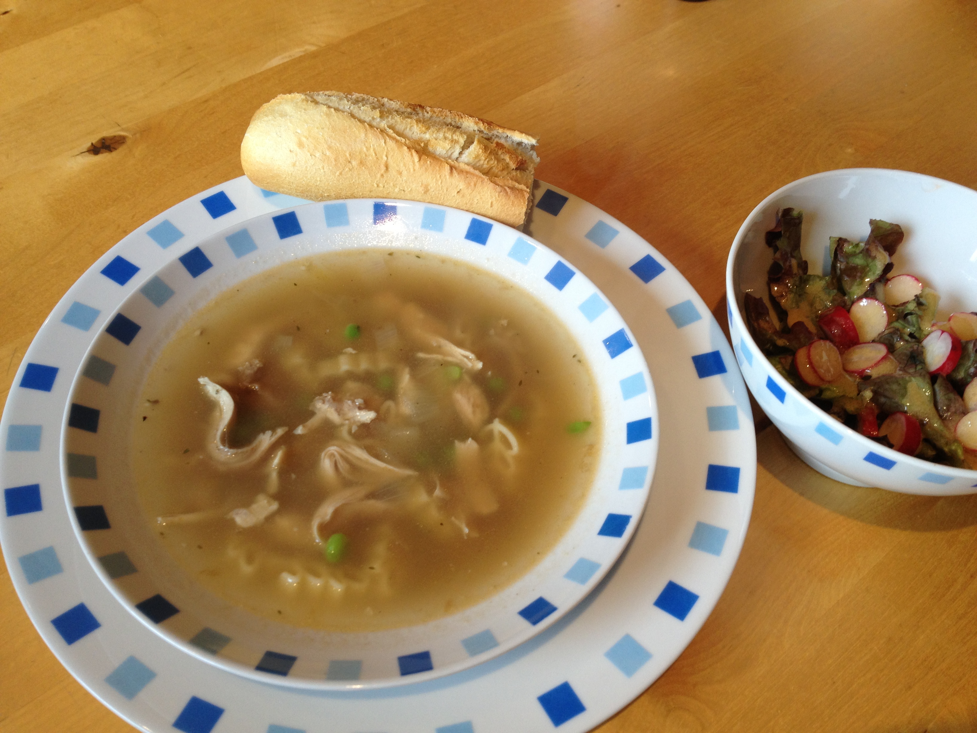 Cleaning out the freezer. I used the rest of the homemade chicken stock and leftover roast chicken, the last of the Epinettes, leftover peas, and voila! Chicken noodle soup with salad and baguette. I am determined to make these groceries last until the Sunday farmers market. We’ll see what I can scrounge up for dinner ๐