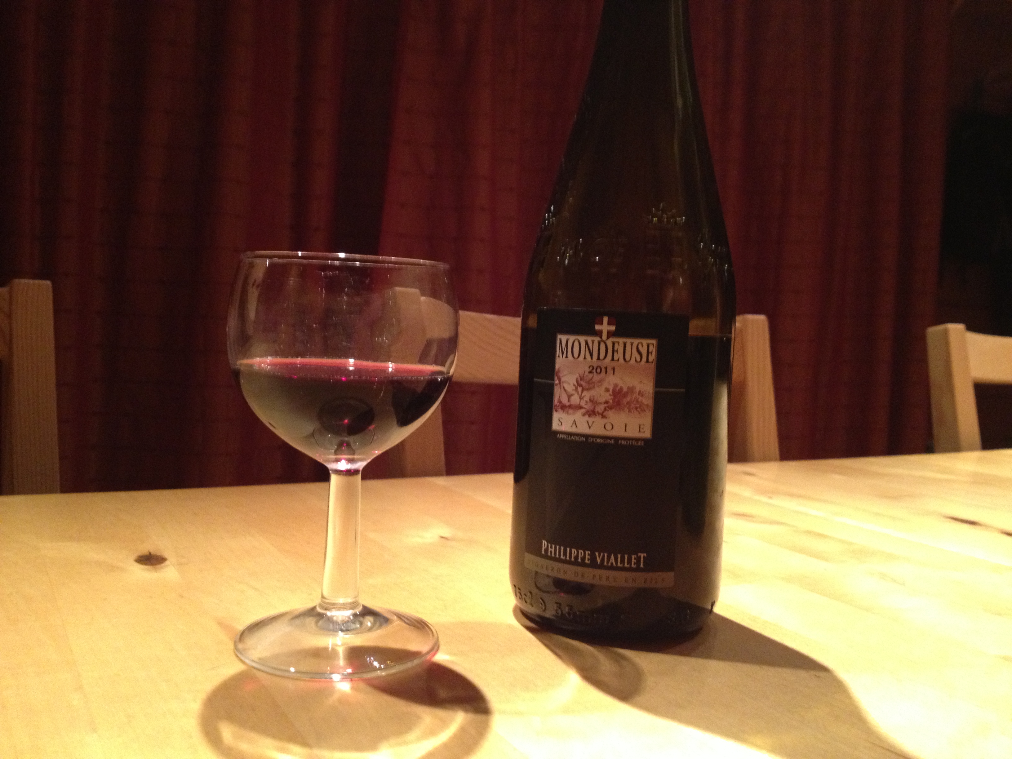 I made pan-seared French “Grillers” with balsamic glazed, caramelized onions and garlic with a crusty baguette generously smeared with dijon mustard, and a salad with balsamic vinaigrette and Chevrotin. We’re on our last bottle of wine- Emergency! It was a very nice Savoie region Mondeuse – nutty, with hints of fresh grape and subtle red fruits (think raspberry, strawberry, and red current). Yum! Not bad for scraping up the last bits!!! We do not feel deprived, in fact, we may be feeling a heart attack coming on ๐