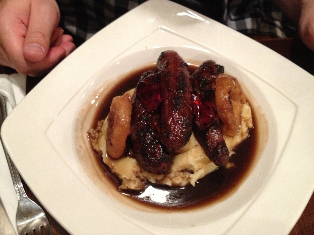 So delish! Super crispy fish and chips! Absolutely amazing with malt vinegar and mayonnaise! Adam had wild venison bangers and mash with black current jelly and stout gravy. Whoa! It was really good. The sweet and tangy jelly worked perfectly with the earthy, savory venison sausage and smokey gravy. Yum!