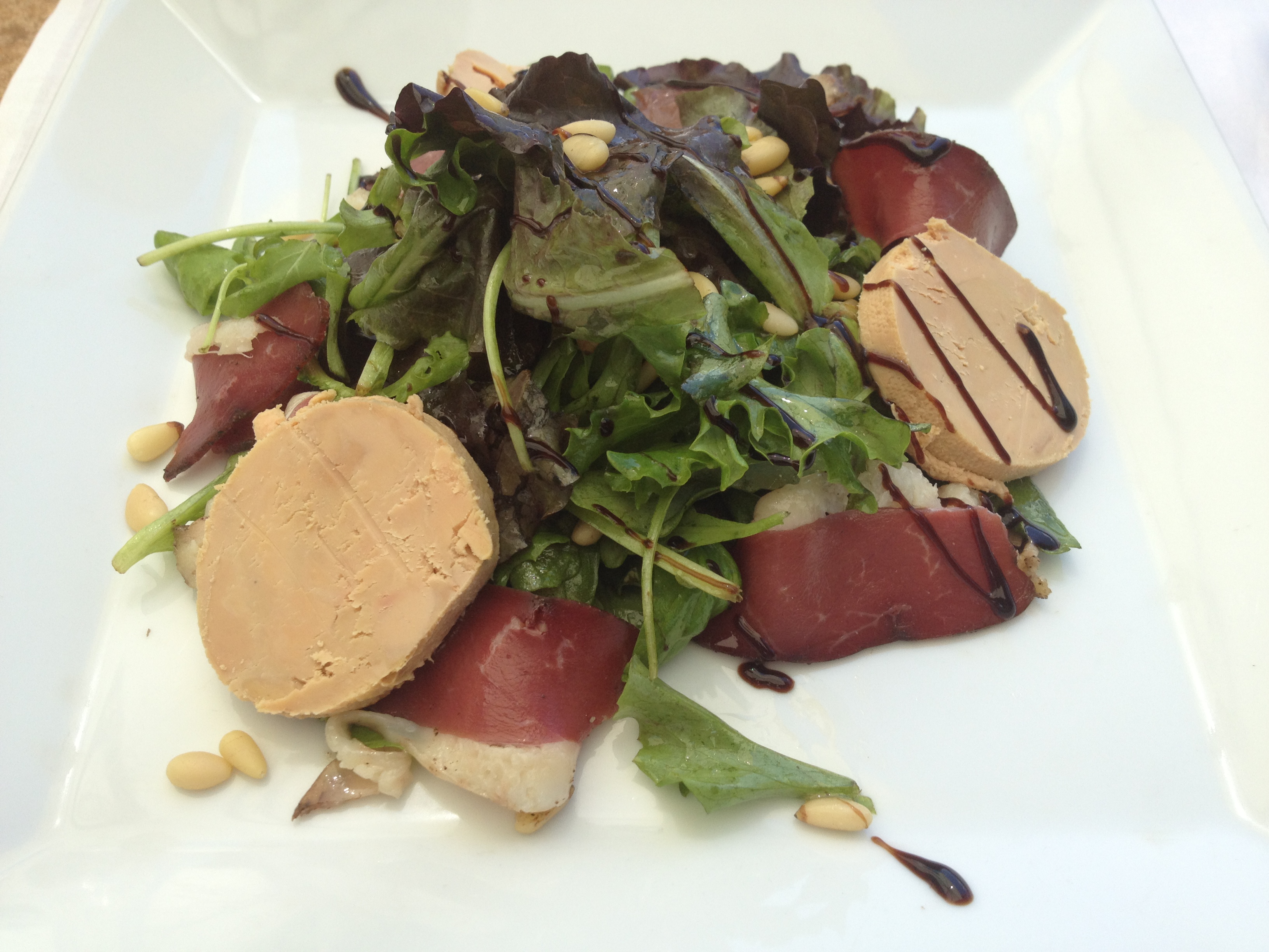 We each started with the salad of the day which was fresh greens with duck prosciutto, foie gras, pine nuts and balsamic vinegarette – excellent! The foie gras was the best we’ve ever had – smooth, buttery, subtle minerals and salt. Awesome! Unfortunately, the entree didn’t stand up to the setting or the salad. It was a pan seared fish (not sure what kind – “zubelette”?), on a bed of finely diced vegetables and dried fruits (why?), and butter risotto. The risotto was totally bland – overly buttery (I know! I didn’t know that was possible!), lacking salt and pepper, and no contrast of flavors. The plate was, however, beautifully and simply presented.
