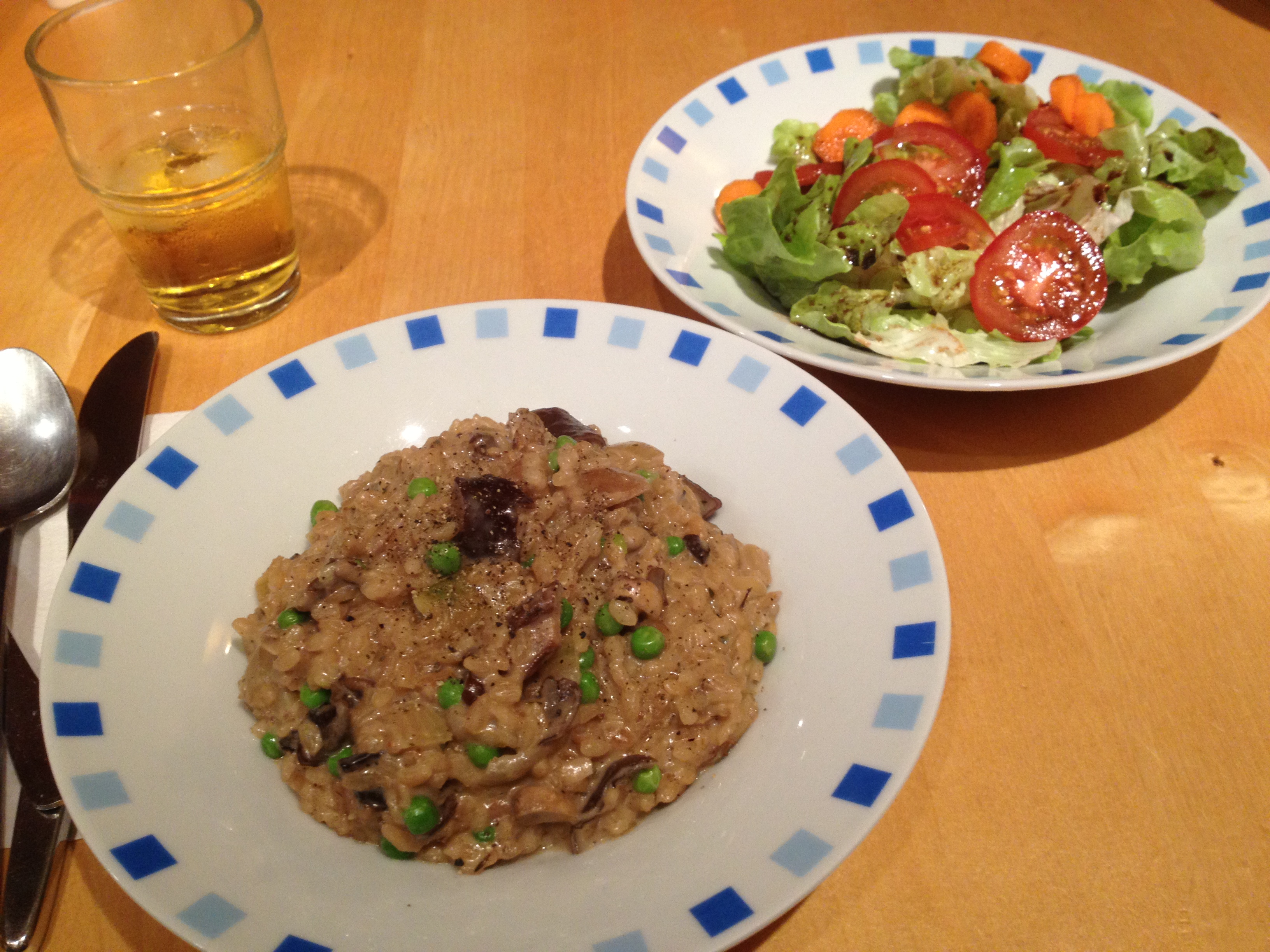 Tonight is our last night in the chalet 😦 We’ve had such an amazing time here. It has gone way too fast! We didn’t want to buy more groceries, so we had a “clean out the fridge dinner”. It was very good! I made a mushroom and pea risotto with creme fraiche and Adam made a fresh green salad. Not bad for an almost empty refrigerator!