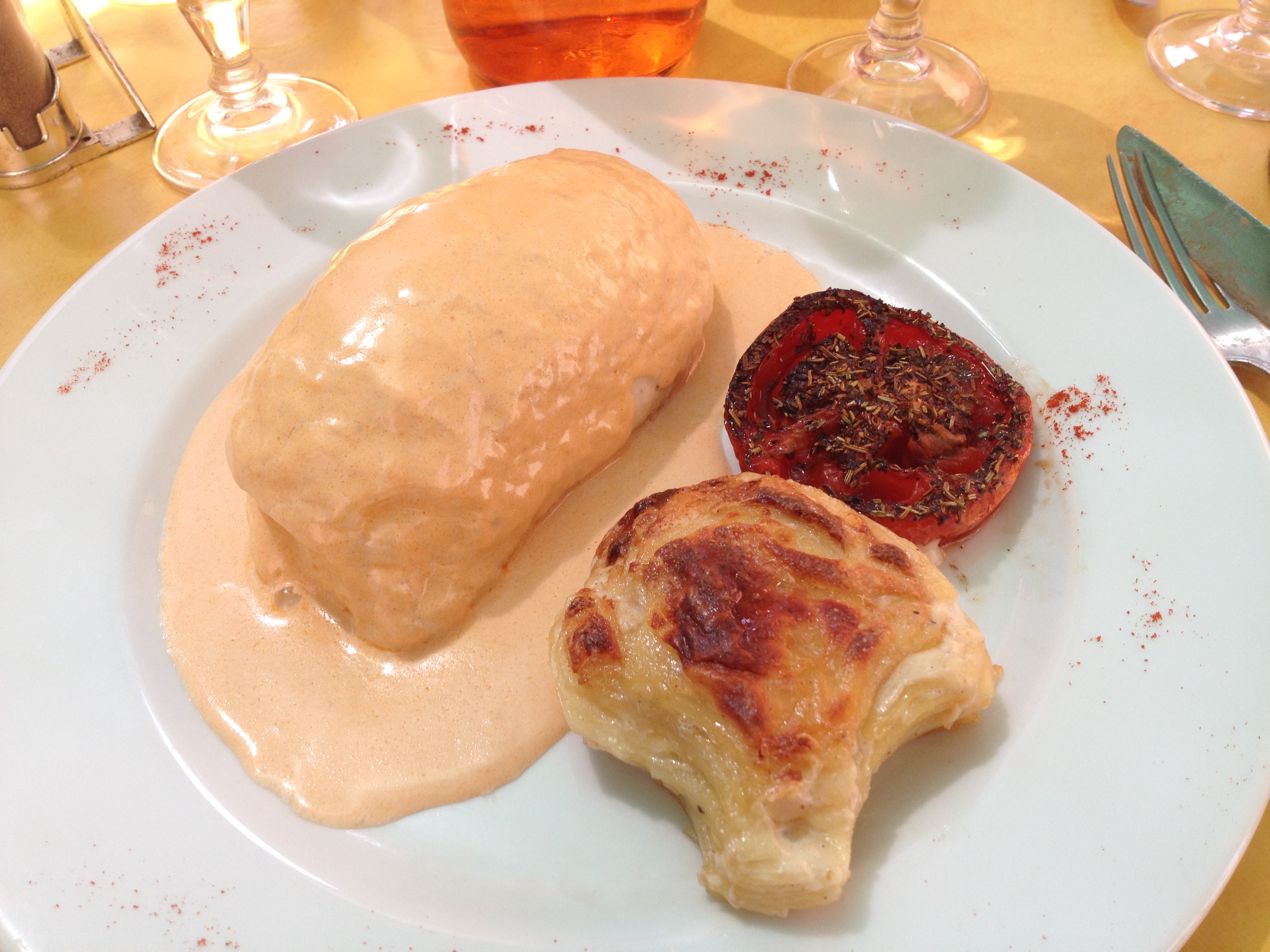 We both started with the salad Lyonnaise – fresh greens, bacon, croutons, and a poached egg. Wow! That’s going on a weeknight menu at home for sure! I had the white fish quenelle with crawfish and cream sauce. It came with delicious potatoes dauphinois and a roasted tomato. This was my first taste of a true quenelle (a French classic) and I must admit it was disappointing – too bland and textureless. It needed something crunchy or chewy, spicy or sour… I’m still dreaming of Thai food 😉 The potatoes were excellent and the tomato provided a nice acidic contrast to the rest of the creamy meal. Adam had the hot Lyonnaise style sausage with a red wine sauce, potatoes, and a roasted tomato. The sausage was great! Garlicky and salty with a great casing that popped in your mouth. Yum! We then had dessert, of course! Adam had pistachio and vanilla ice cream and I had the lemon tart. Both were very good. We finished with espresso.