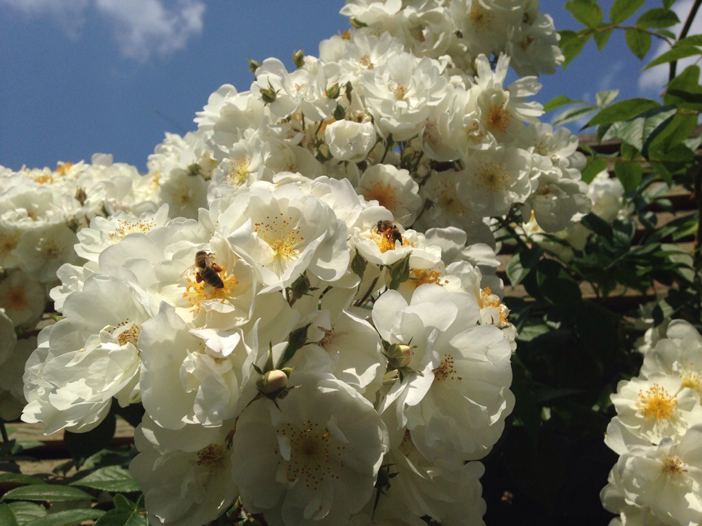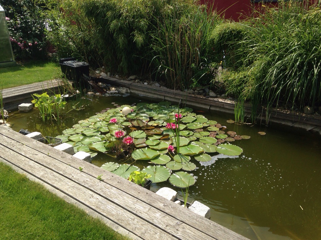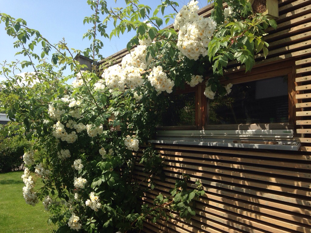I enjoyed a sweet, rose scented, hour long breakfast- first at the patio table, then lounging on the deck. Toasted brown bread with butter, salt, and Himbeer jam (red raspberry) with nectarine and blueberry fruit salad. The coffee was tasty, too. All to the soundtrack of nature: birds singing, fountain bubbling, and bees humming!