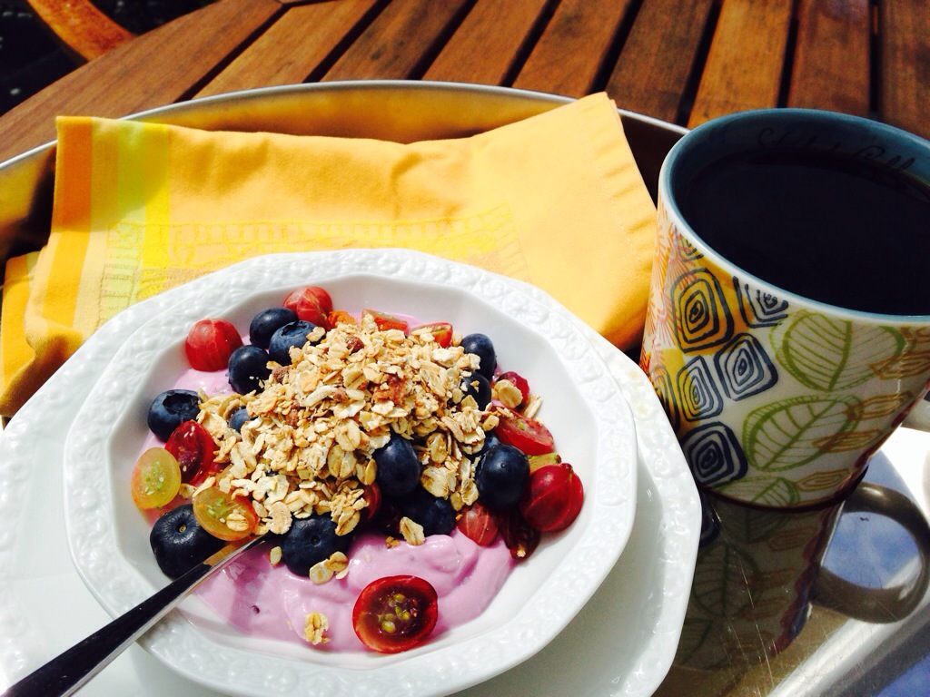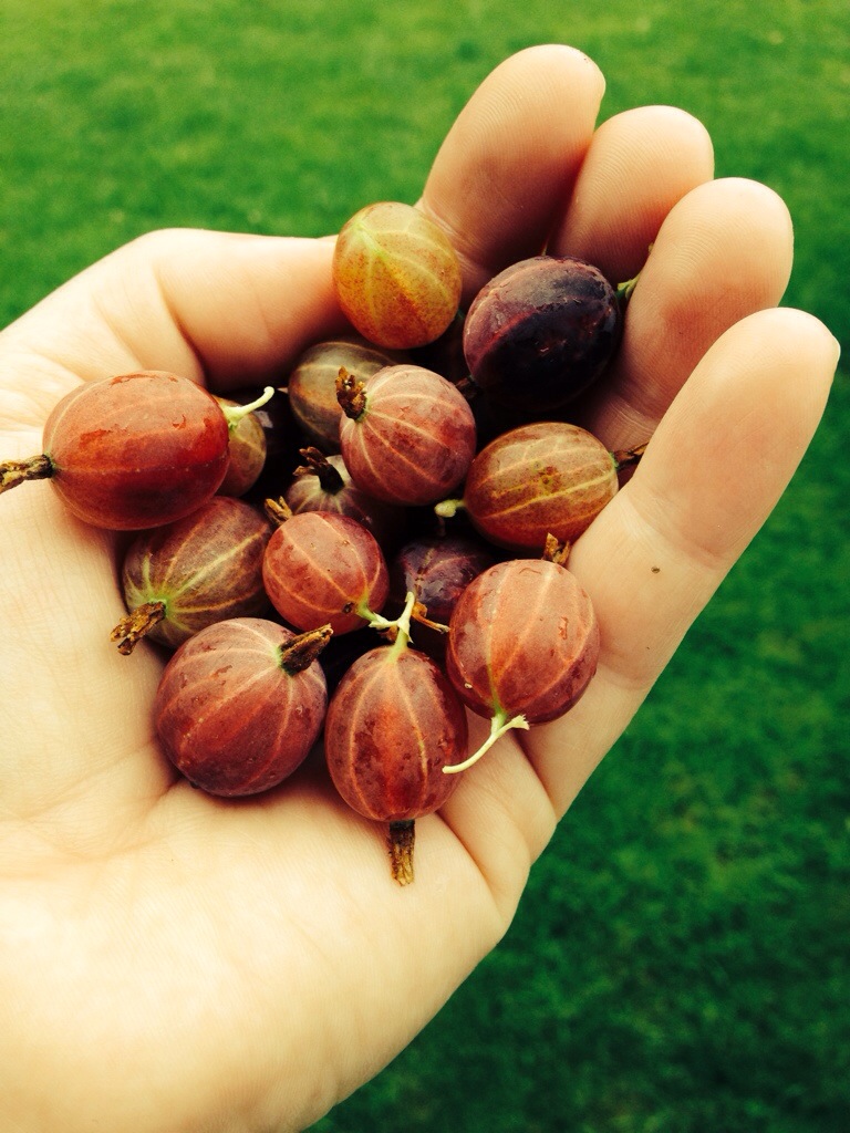 It was cool and rainy this morning, so we decided to sleep until afternoon:) When we woke, the sun was shining and the currants were begging to be picked- still not sure if they’re actually ready, but they taste sooo yummy, like extra tart red raspberries! I made black current yogurt parfaits with blueberries, fresh-picked currants, and a sprinkling of muesli. Great way to start the day… Even though it’s 2pm 🙂