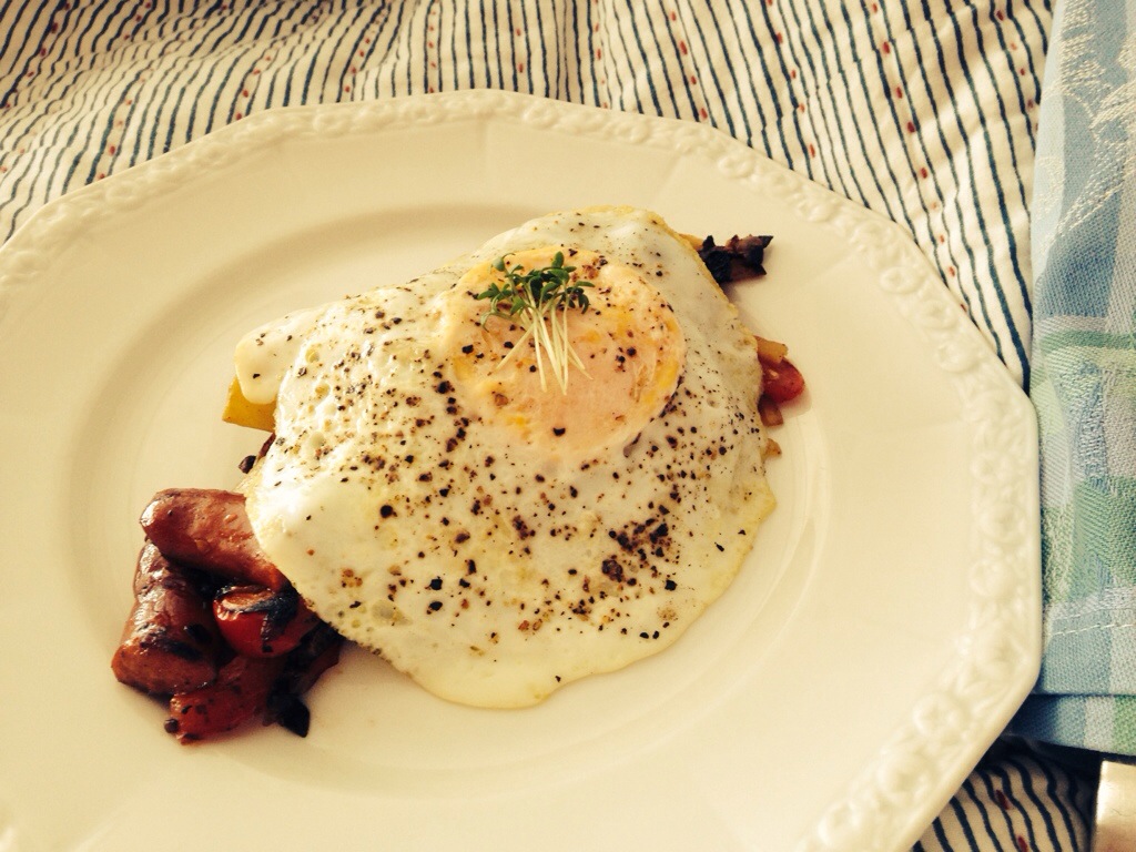 First he brought me a rich cup of espresso, then a hearty, smokey hash of potatoes, smoked sausage, red bell pepper, onion, and garlic with a perfectly fried egg on top. Well done, love!