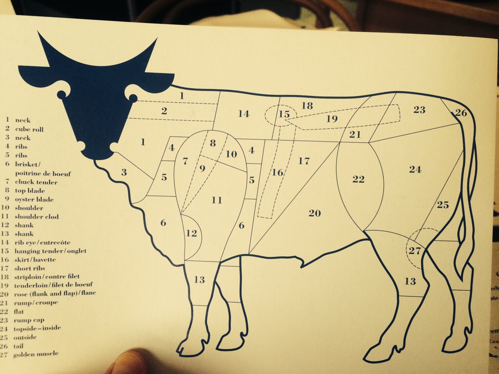 After a short intermission, the steaks arrived. Adam had the Hanging Tender – wet aged for 28 days- with French fries and the mushroom sauce. Again. Amazing. The fries were so good. The steak was perfectly cooked medium rare with a smoky char on the outside. I had the Flap. Again, perfect. With the perigord sauce (truffle, butter, port) and the mixed vegetable salad. Wow!