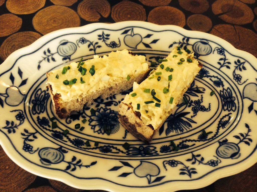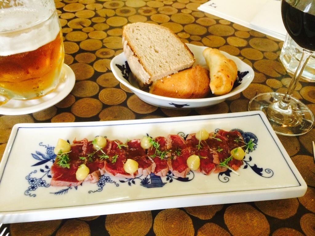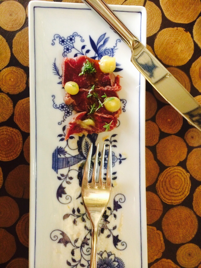 Before we ordered the chef sent an amuse-bouche. A lovely custom in better restaurants. It is a single bite appetizer sent as a gift from the chef to “amuse the mouth”, to get you excited to eat and to offer a glimpse into the chef’s style. We had a small piece of Czech bread (similar to light rye) with a light egg salad spread topped with chives. Yum- I was amused!