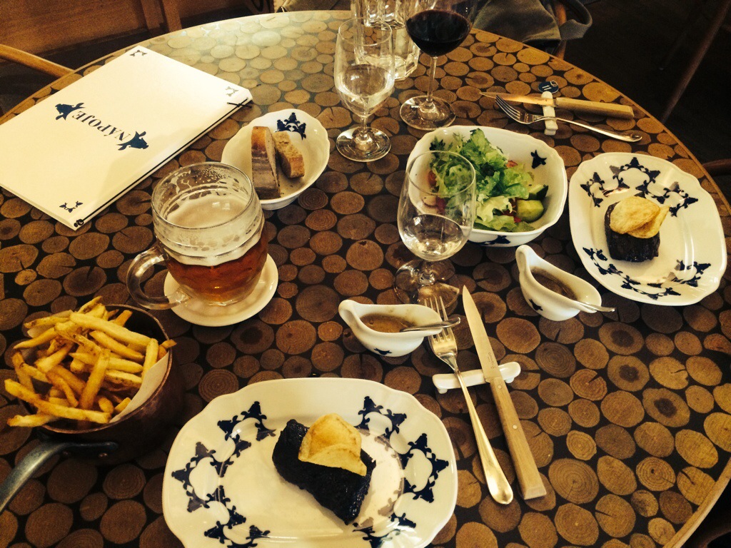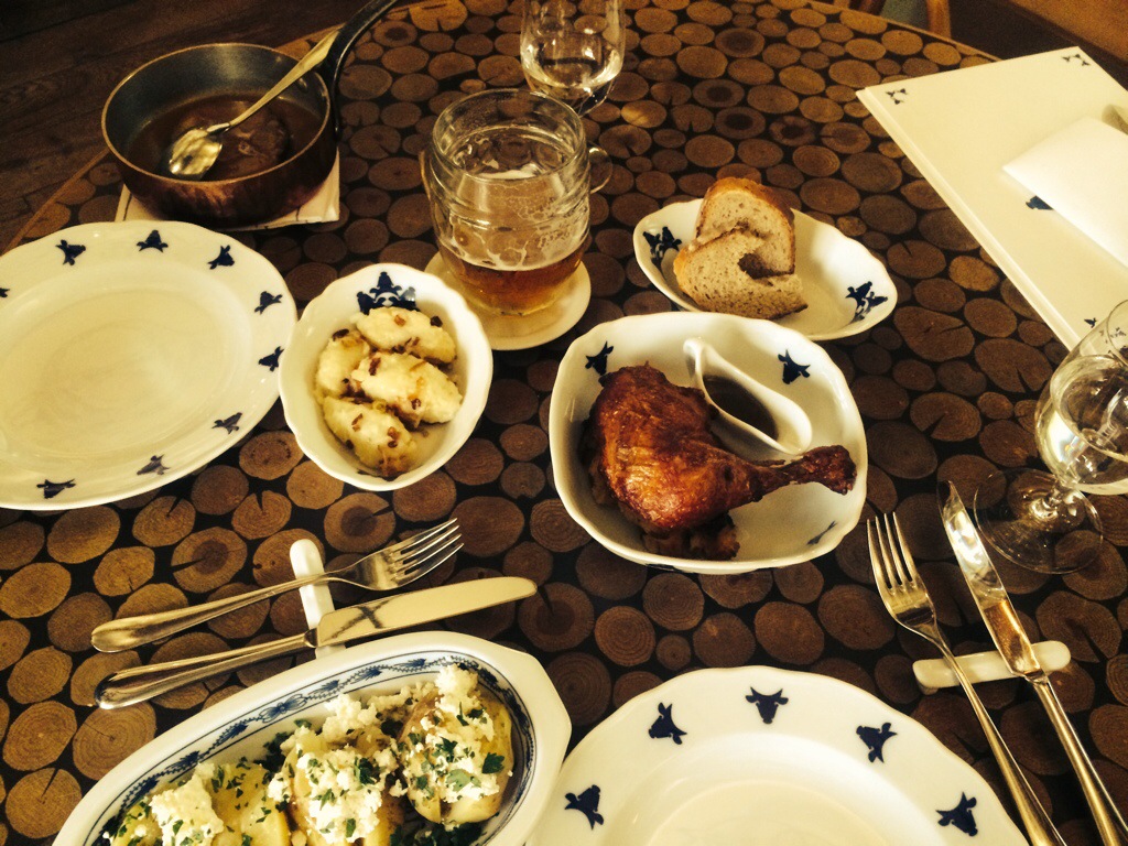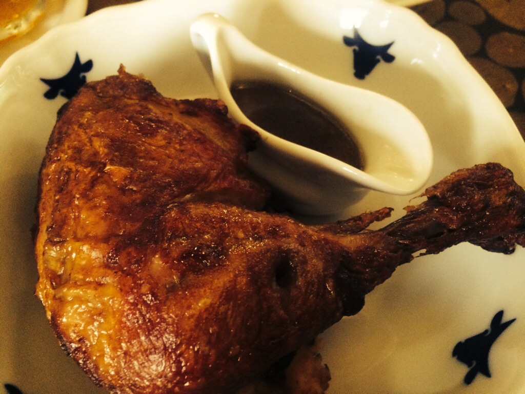 Adam had the unfiltered cask-conditioned Pilsner Urquell. I had the Cuvée Čestr 2011- a spicy, fruity red perfect for steak and roasted meats. For our second course Adam had the Golden Muscle and Shank slow cooked in goose fat served with a delicious gravy and onion potato dumplings. It was deeply, satisfyingly homey. I had the roast chicken with truffle stuffing and country potatoes with homemade cream cheese and parsley. Heaven. We had thoroughly tucked into our meals when I exclaimed, “oh my goodness! It’s Thanksgiving!”. Seriously. Everything was so delicious. There was so much of it and it was only the second course! Did I mention heaven?