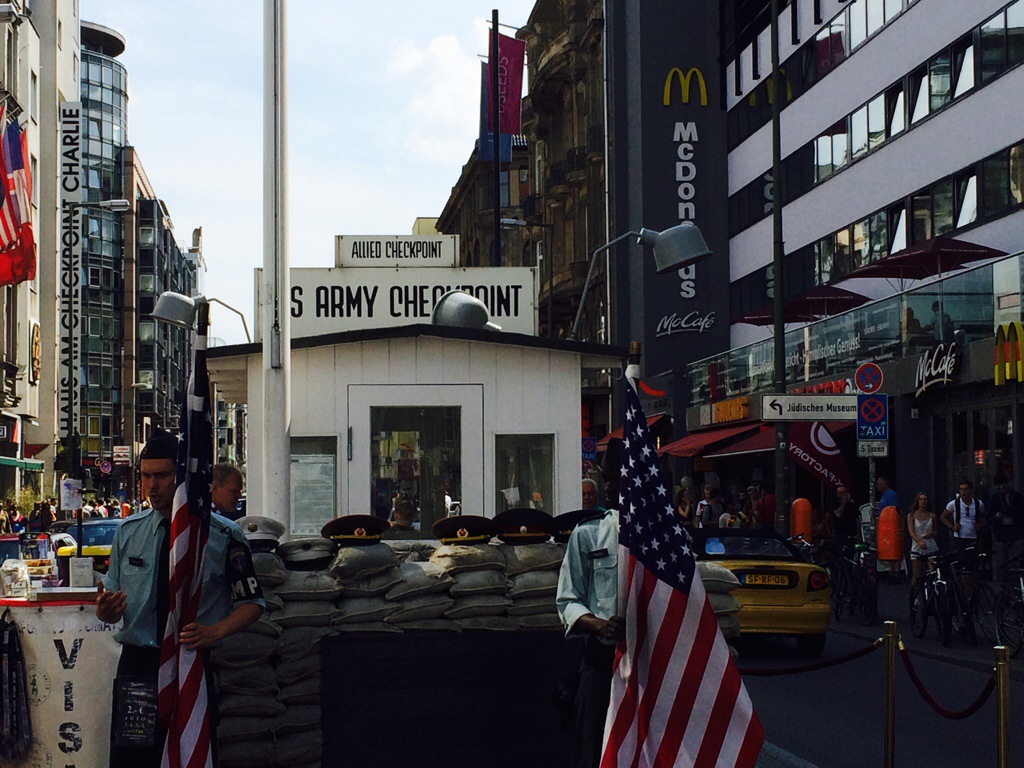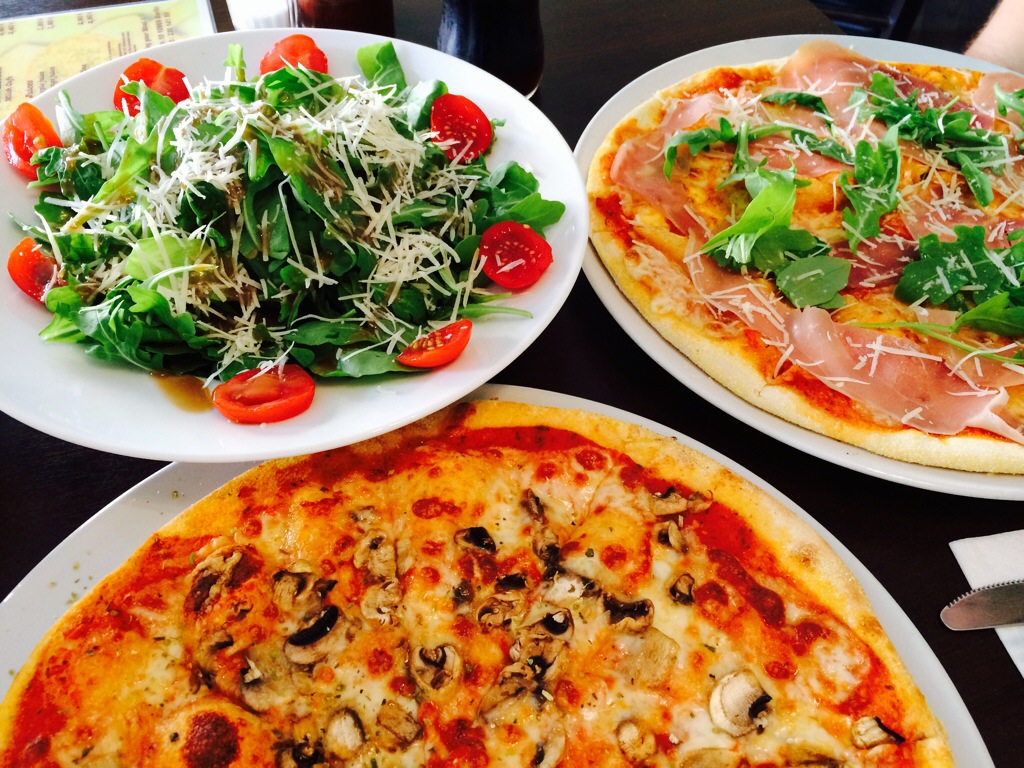 Our noses led us to a little pizza place near Checkpoint Charlie. Unfortunately it smelled netter than it tasted, but it did the trick 🙂 Adam had the Parma pizza- Parma ham, Parmesan and arugula. We shared an arugula and tomato salad. I had the fungi pizza- mozzarella, wild mushrooms.