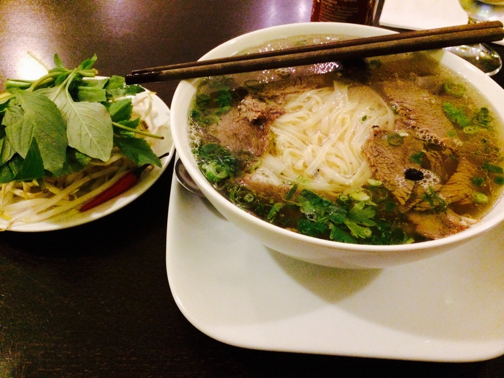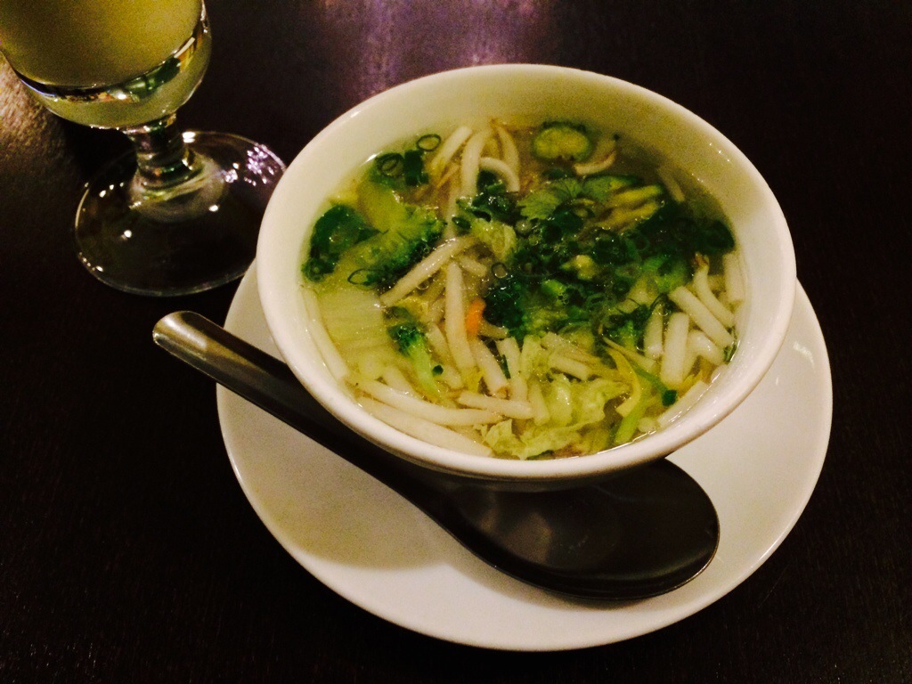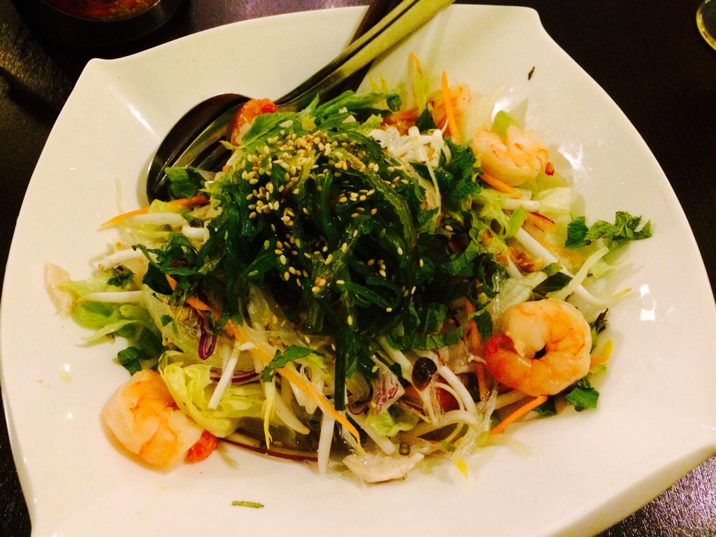 Finally, some really great Asian food!!!! Adam had the beef Pho with a mango-coconut shake. His was a hot and oh-so-satisfying, spicy beef broth with noodles, bean sprouts, and fresh herbs torn and thrown in at the last moment. I had the shrimp and glass noodle salad with a cup of vegetable soup- fresh, clean flavors. Wow, the salad was so fresh – lime, mint, basil, and cilantro with chewy glass noodles and perfectly cooked shrimp topped with seaweed salad!!! I also had the avocado-coconut-mint shake- an unexpected, but splendid combo! Thanks Miss Siam πŸ™‚