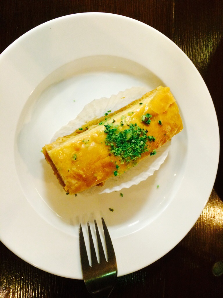 I had the vegetarian platter- roasted eggplant, zucchini, and sweet potatoes with salad, olives, tahini, yogurt sauce, hummus, falafel, fried Halumi, pita, and tabouli. An awesome mix of a little of everything. I loved it- especially the falafel with sour yogurt sauce! Adam had the grilled salmon with dilled rice, salad, charred tomato, and pita. His was great, too! We finished the meal with baklava. Typically one of my favorite desserts, but this variety was made with peanuts. Obviously, peanuts are the worst nut. Cheap, not technically a nut! Walnuts would’ve made the baklava edible 😦