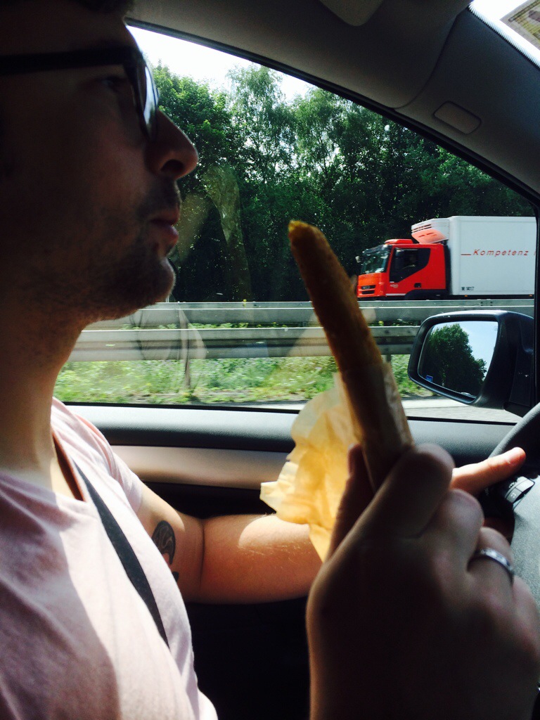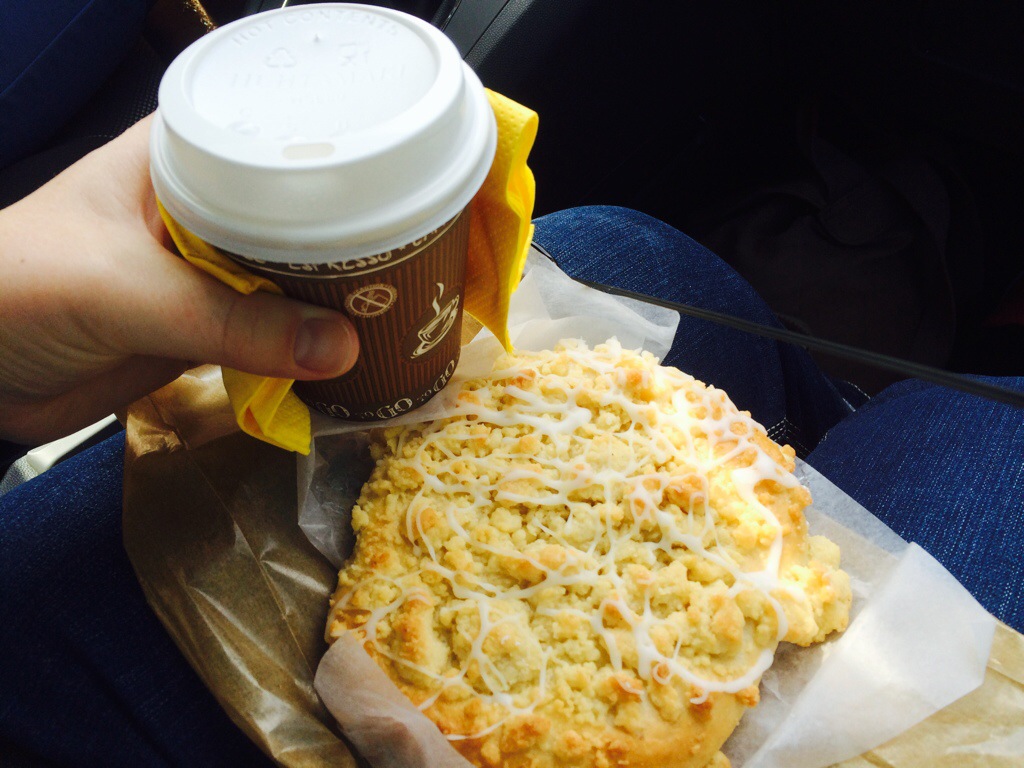 Eating on the road is not our preferred method of acquiring calories 😦 We had yogurt and berries in the refrigerator, but it seemed really warm when we went back for our goodies. We chose to avoid food poisoning and have an unhealthy breakfast- coffee, strudel crumble pastry, weird taquito thing.