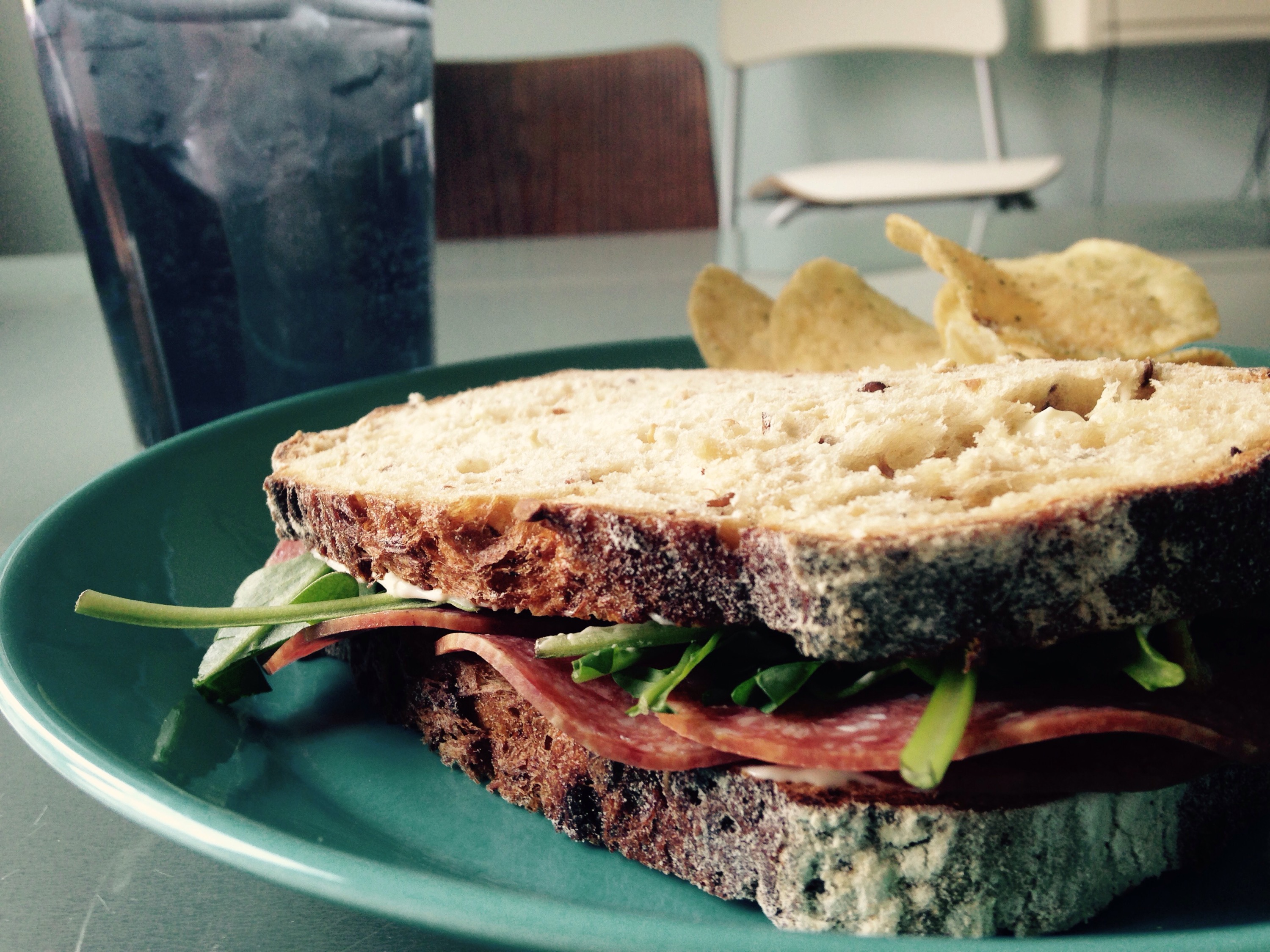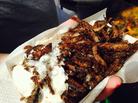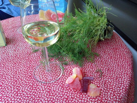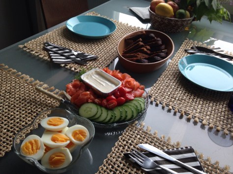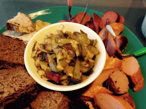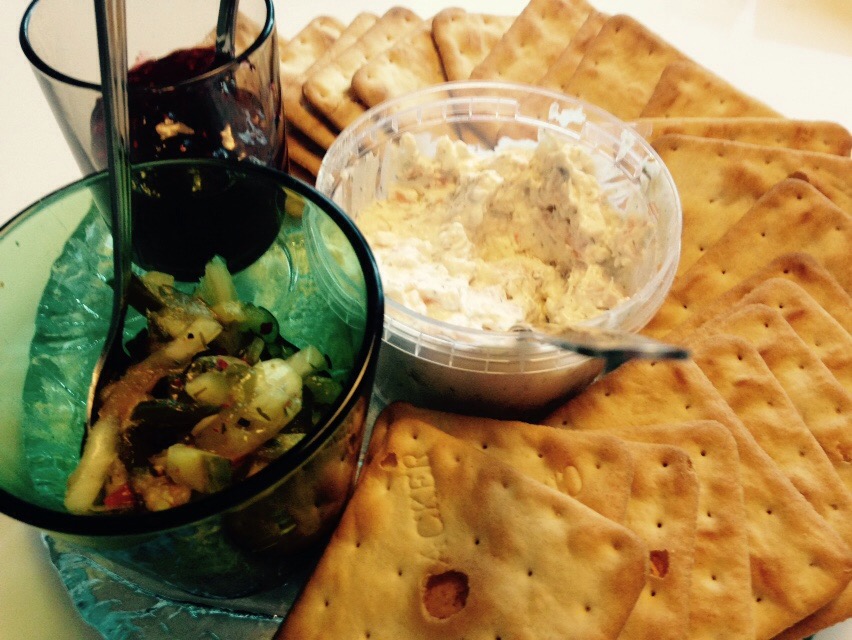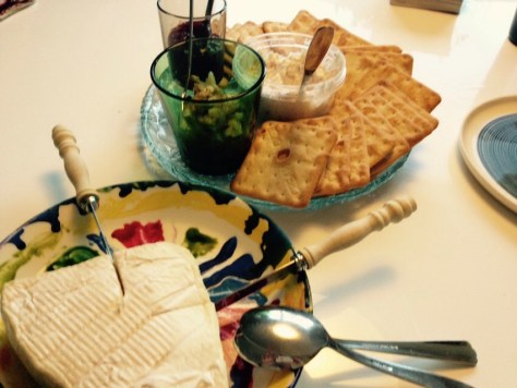 We had smoked salmon spread, spicy pickles we bought at the market from the man who made them, Brie, raspberry jam, and crackers. Not too shabby.