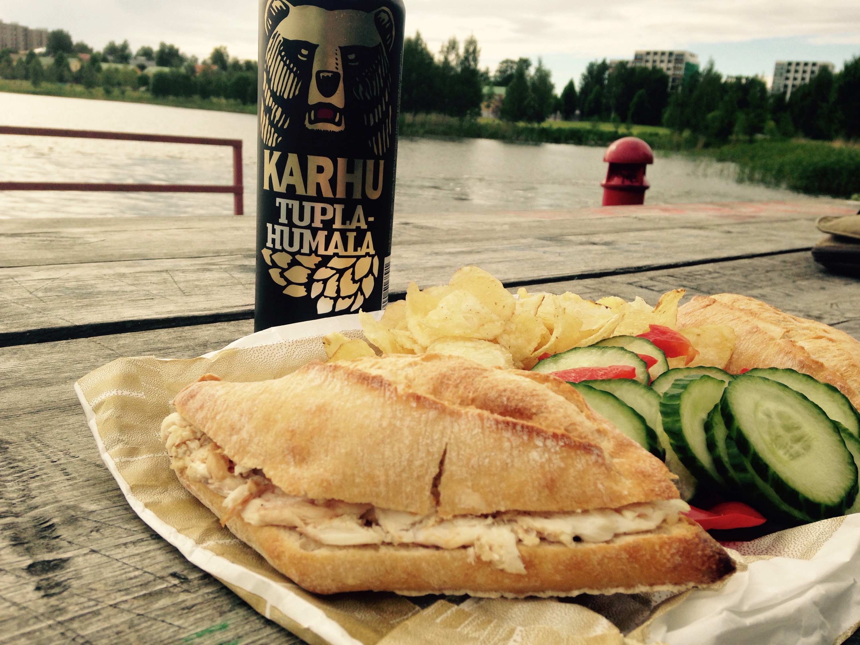 We decided it was time to get out of the apartment for a little while, so we headed to the grocery store. We packed a lunch for the road and headed out. We stopped at a lovely park on a lake on the way. We had smoked white fish with butter and cucumber on crusty baguettes, cucumber slices, red bell peppers, cherry tomatoes, and crunchy chips. All washed down with a wonderful Finnish beer, Karhu (bear in Finnish). What a nice picnic!