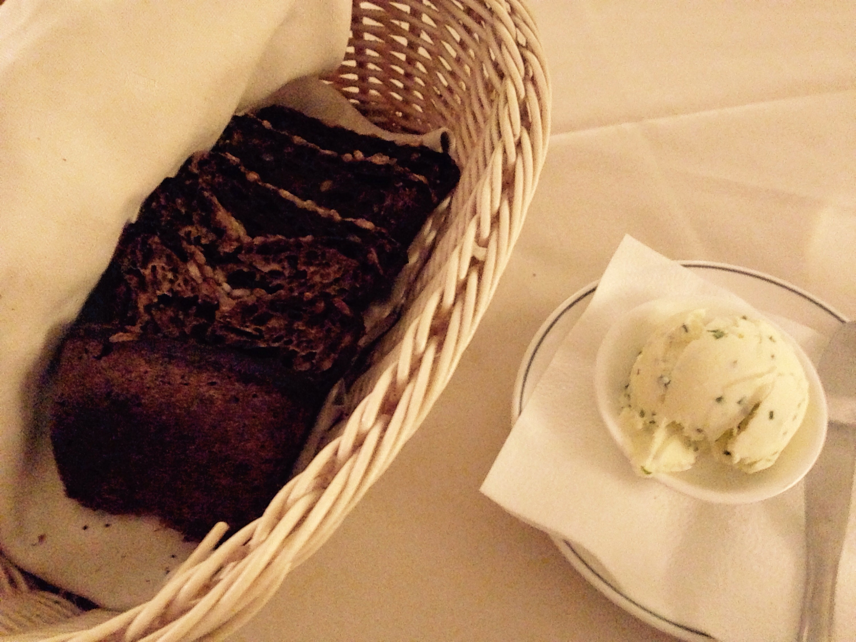 Adam started with beer, of course. I had the Grandma’s Apparetif. It was great! A sweet, tart Aperol and soda mix. The waitress brought out delicious, hearty Estonian rye bread with pumpkin seeds and a fabulous chive compound butter- great start!!!