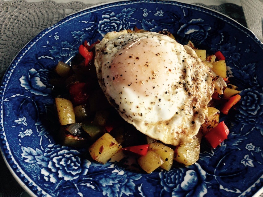 Finally, at about 2pm, we decided to have breakfast. I made potato hash with new potatoes, red bell pepper, and onion. I fried a couple eggs, toasted some bread, voila!