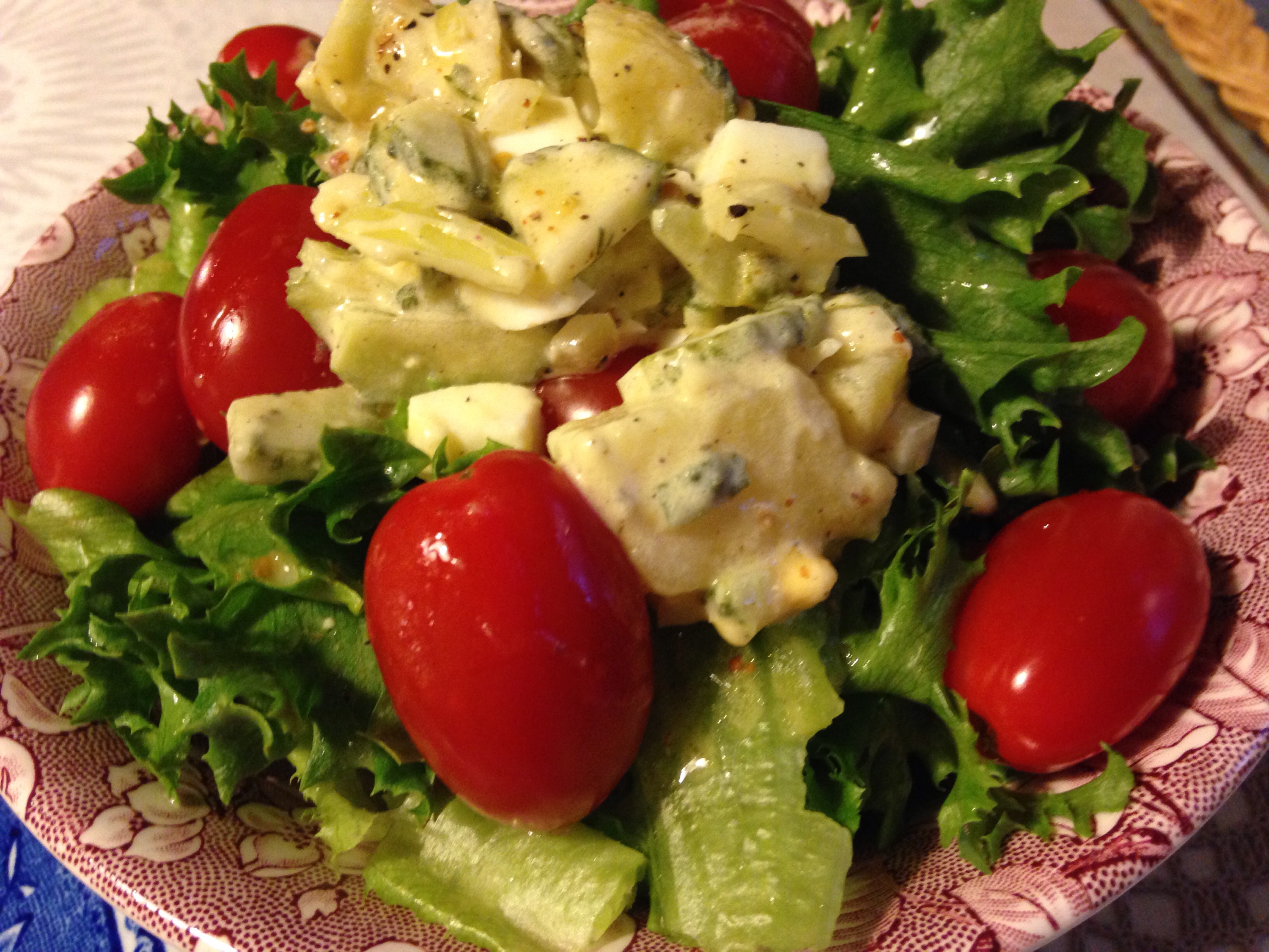Luckily the salad was good! Crisp green lettuce with juicy, fruity tomatoes, and potato salad made with refrigerator dill pickles I made a couple days ago😎