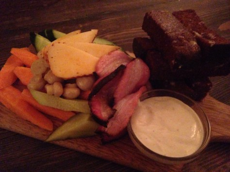 We ordered the “beer snack” starter. It was quite good- smoked Latvian cheese with paprika, crispy garlic bread battons, fresh veggies and creamy garlic dip.