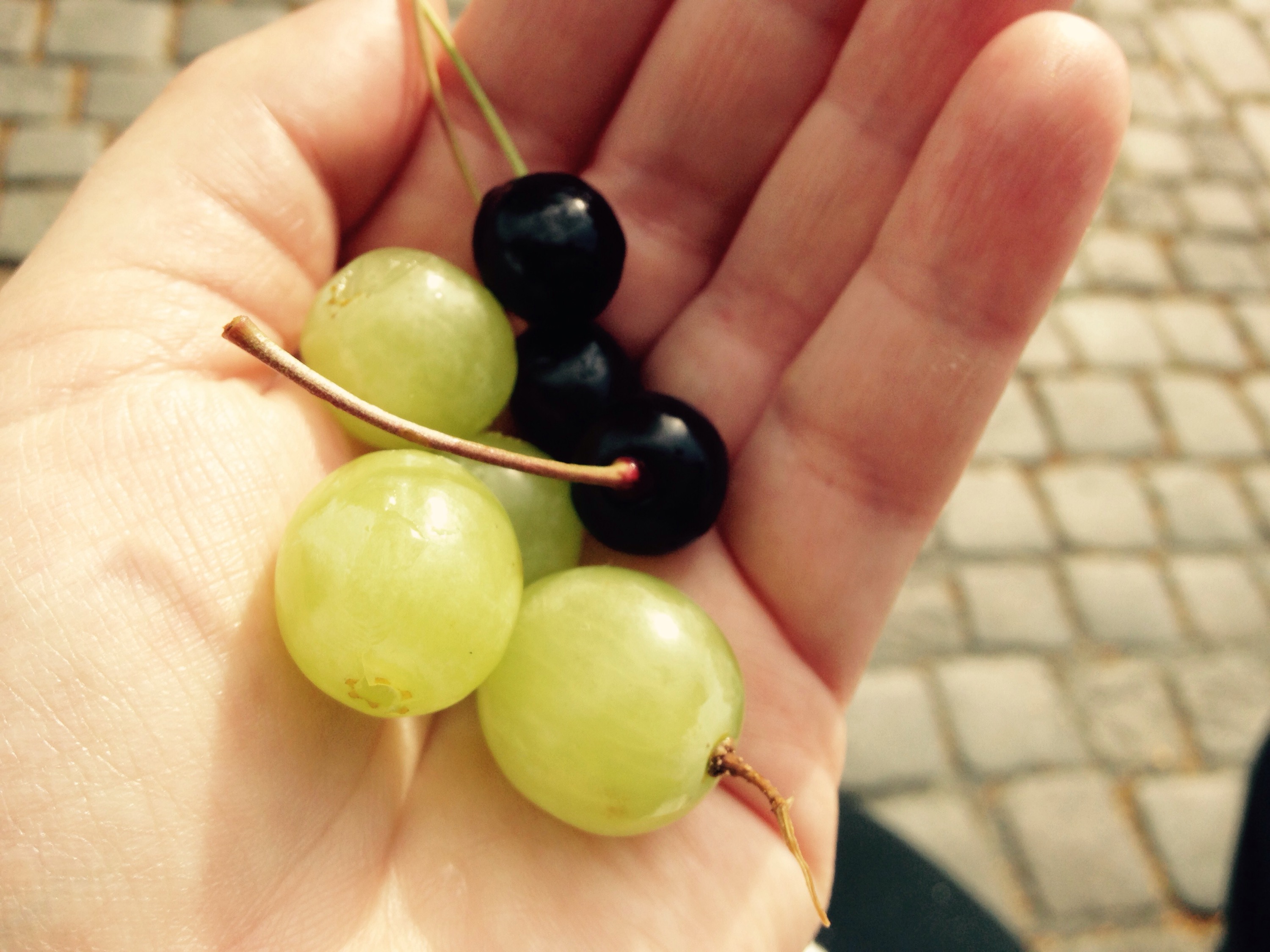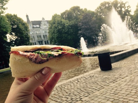 After the museum we walked alon the beautiful pedestrian boulevards and stopped at a lush park for lunch. We had baguettes with roast beef, cheddar, onion, arugula, butter, and mustard, chips, grapes and wild cherries, and fresh veggies. Not bad.