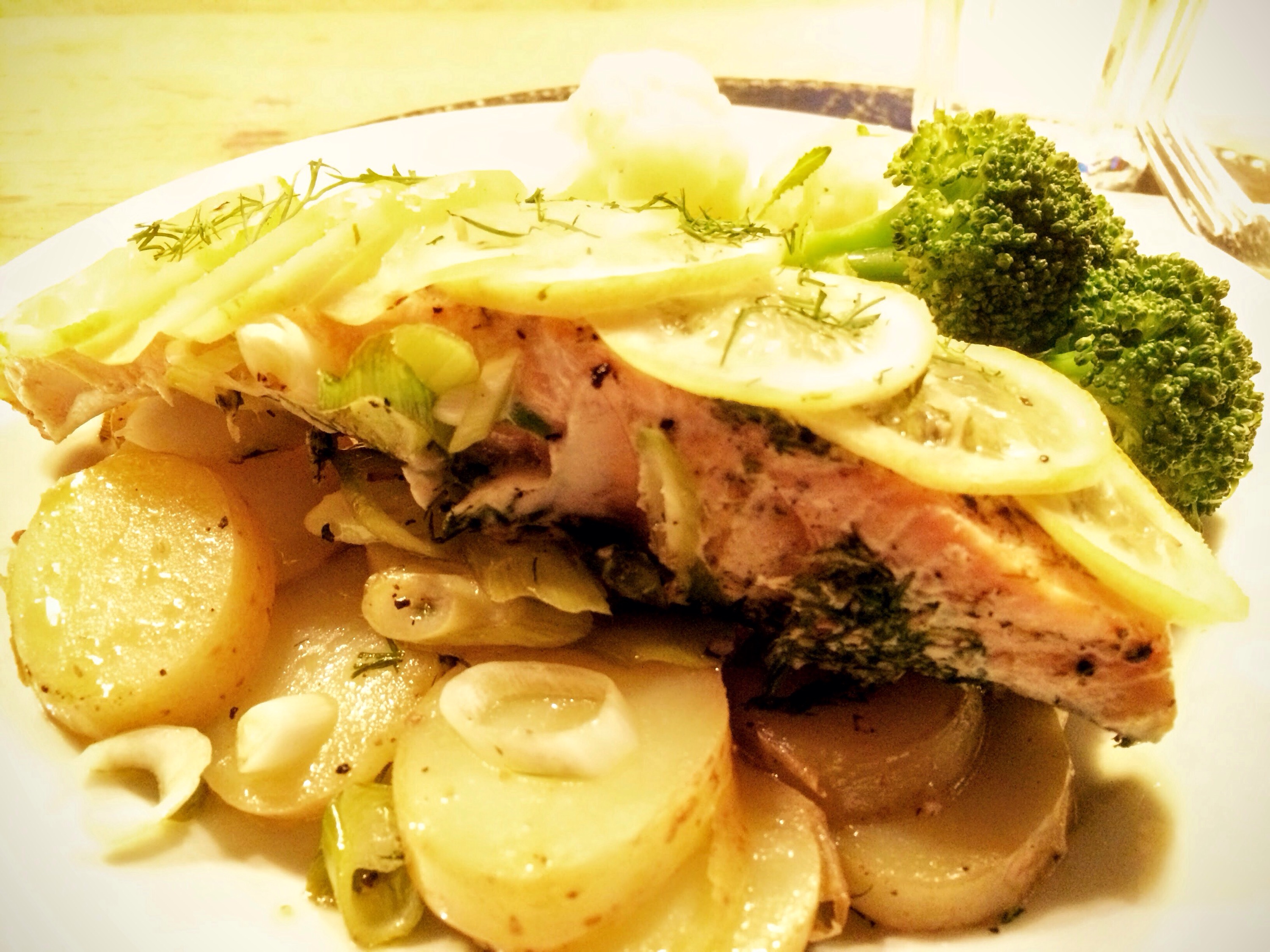 We had dinner at home, like the intelligent, budget-minded people we are๐ I made salmon en papillote- salmon with dill-lemon butter over green onion, and tender little new potatoes all wrapped in foil to trap the steam and tasty juices together. All served with steamed broccoli and cauliflower. I’m a pretty good cook๐