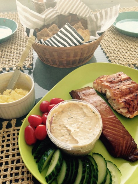 Jill made a wonderful breakfast which she titled, “Salmon threeways”. The salmon was deliciously smoked, grilled, and blended into a cream cheese and dill spread. Served with tomatoes, cucumbers, toast and crackers, and fragrant little strawberries. Mmmm!