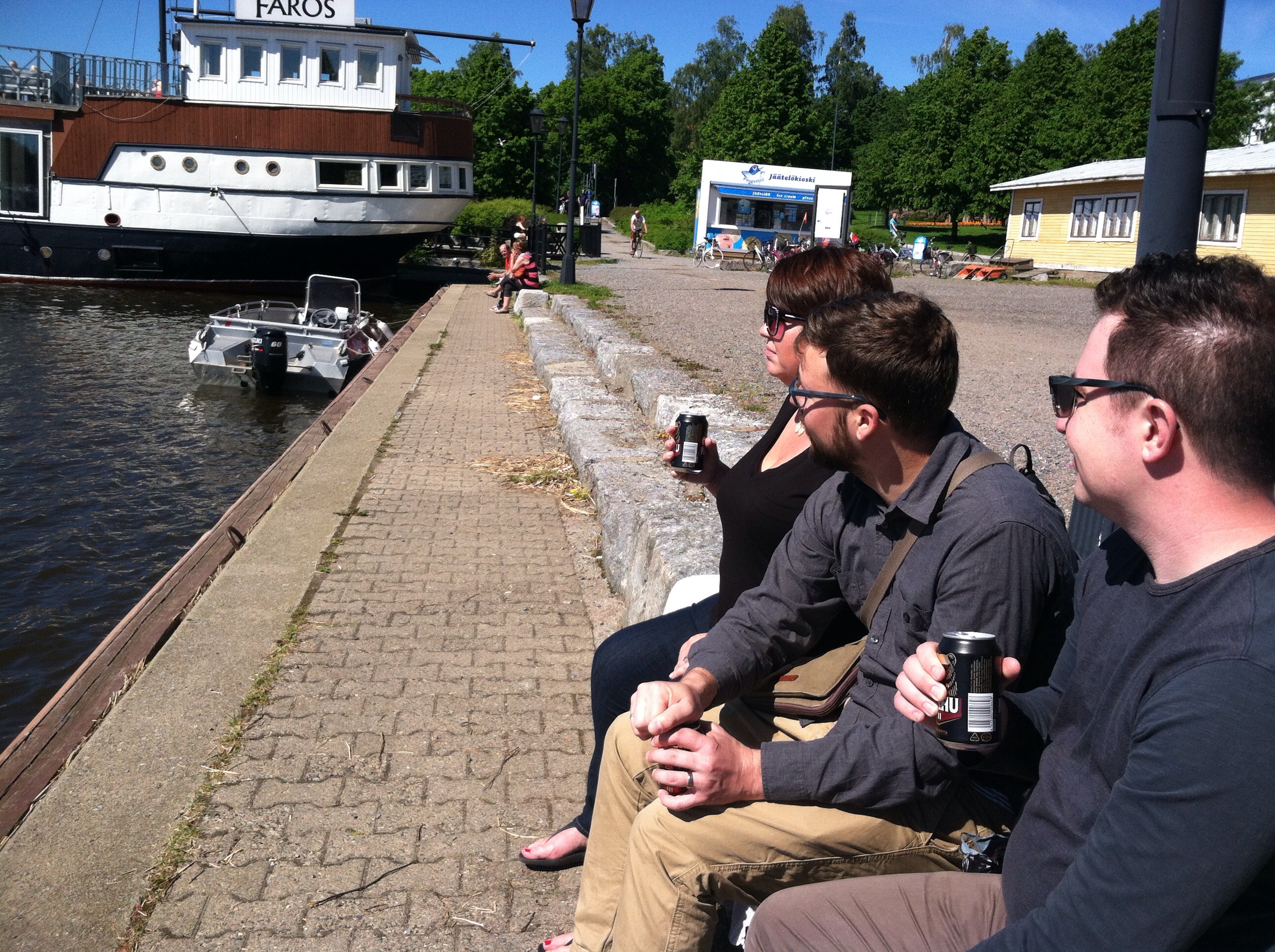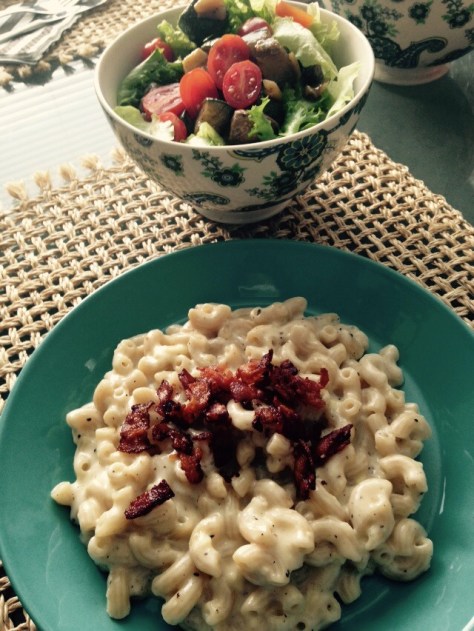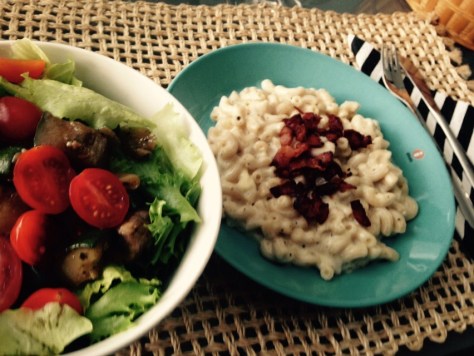 To start, I made salads with tomatoes and sautéed zucchini, onion, and mushrooms topped with balsamic vinaigrette. For the entrée, I made creamy Brie, chèvre, and Parmesan mac’n’cheese with crispy bacon on top, crusty baguettes with butter, and a wonderful French red wine Yvonne and Björn left for us. Thanks guys! 😍