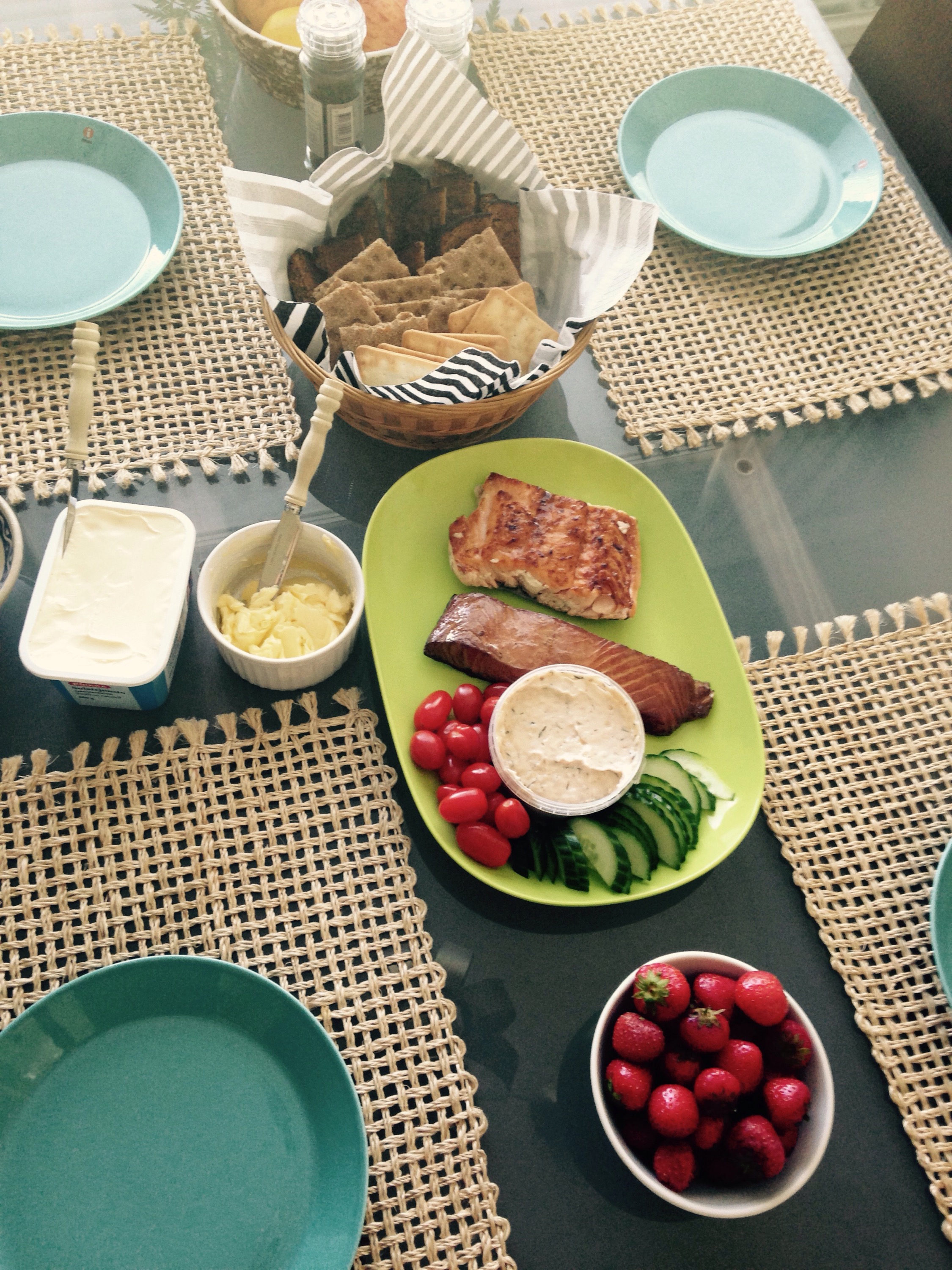 Jill made a wonderful breakfast which she titled, “Salmon threeways”. The salmon was deliciously smoked, grilled, and blended into a cream cheese and dill spread. Served with tomatoes, cucumbers, toast and crackers, and fragrant little strawberries. Mmmm!