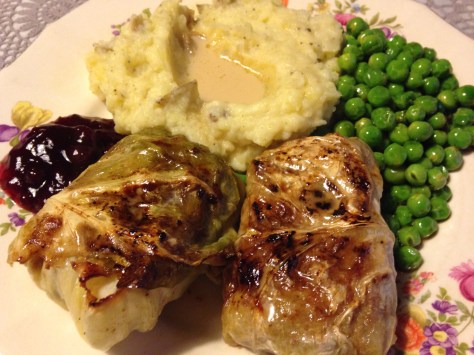 i did some research and decided to make some traditional Finnish meals, including Kaalikaaryleet – stuffed cabbage leaves. I stuffed the blanched leaves with a mixture of ground beef, jasmin rice, onion, minced cabbage, garlic, allspice, nutmeg, and an egg to hold it all together. I sautéed each little bundle in butter until golden, then baked them uncovered with some cabbage cooking broth, cream, and some golden syrup. I served them with lingonberry jam, mashed potatoes, and fresh shelled peas sautéed in butter. Mmmm!