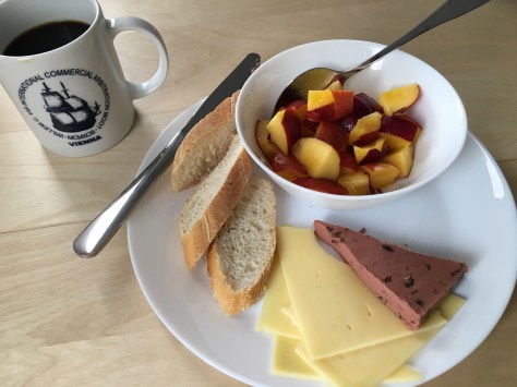 Uncategorized Breakfast in Vienna! June 26, 2017 Charity Prawitz 1 Comment Sweet-tart nectarines, coffee, baguette, cheddar, and pate. Mmmm! Share this: Click to share on Facebook (Opens in new window) Facebook Click to share on X (Opens in new window) X Like Loading... Related