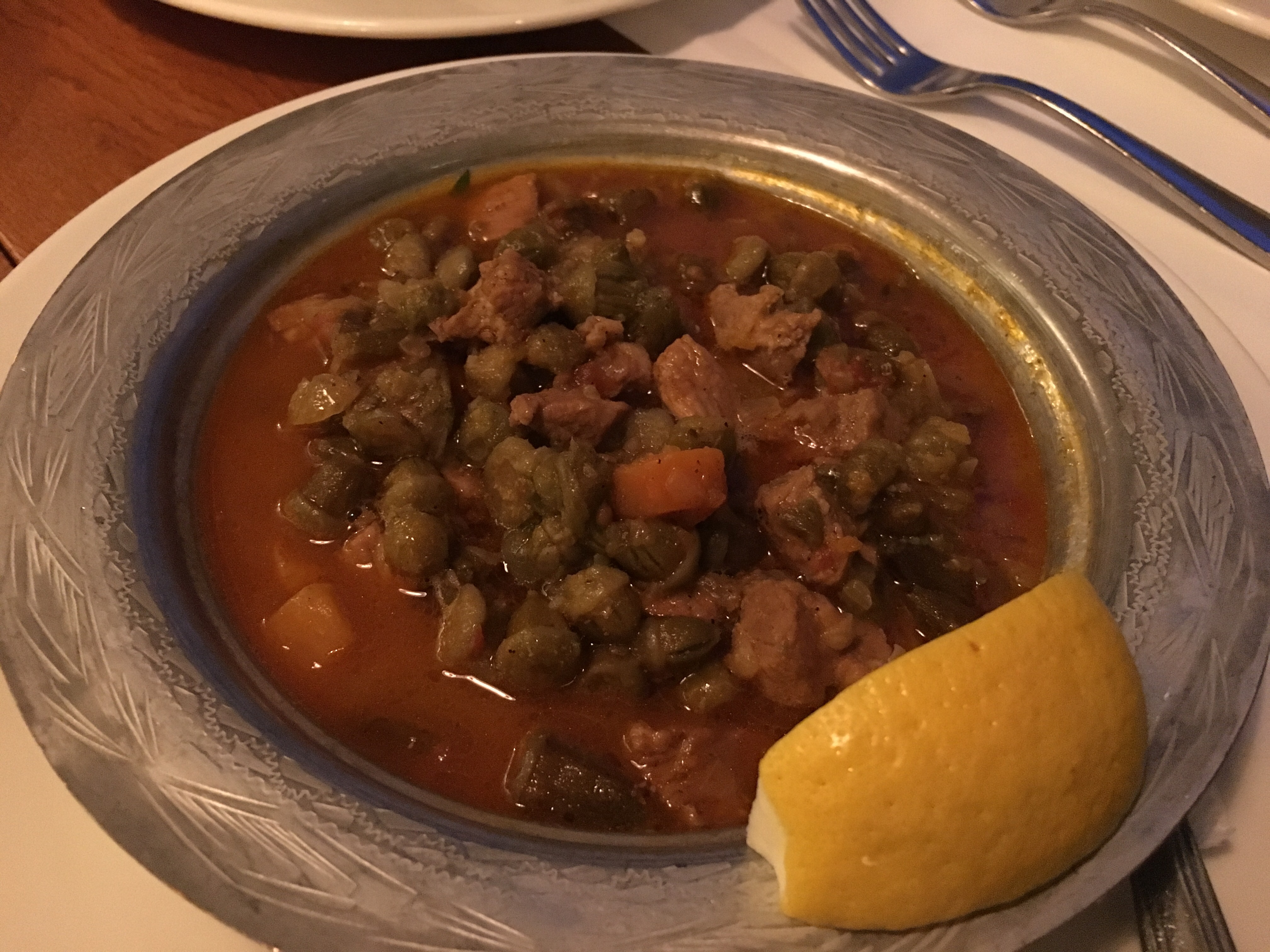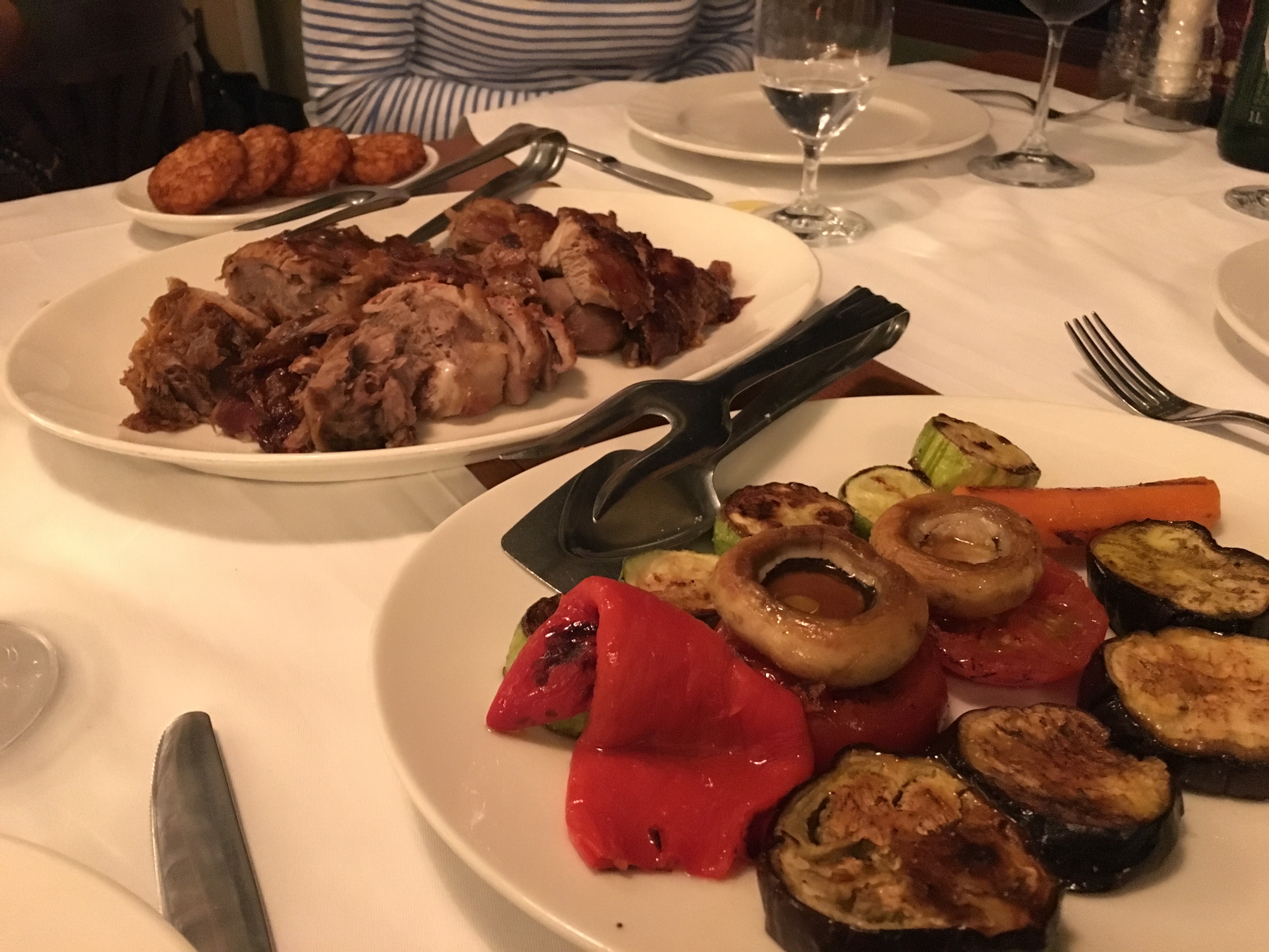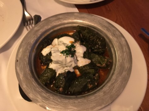 Crispy hash brown like potato pancakes, spit roasted lamb (the house specialty) and grilled vegetables. All we’re delicious. I especially loved the lamb. It was minimally seasoned, which accentuated the flavorful lamb. It was really good with the cucumber and sour cream salad.