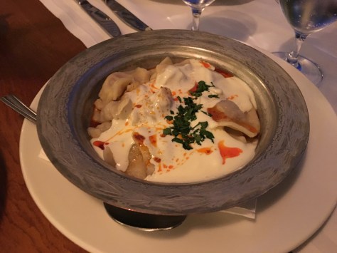 Fresh Bosnian pasta, Klepe, similar to ravioli but with uniquely Bosnian flavors. The filling was light and flavorful lamb or maybe beef wrapped in succulent fresh pasta and topped with a tangy sour cream sauce. Yum!