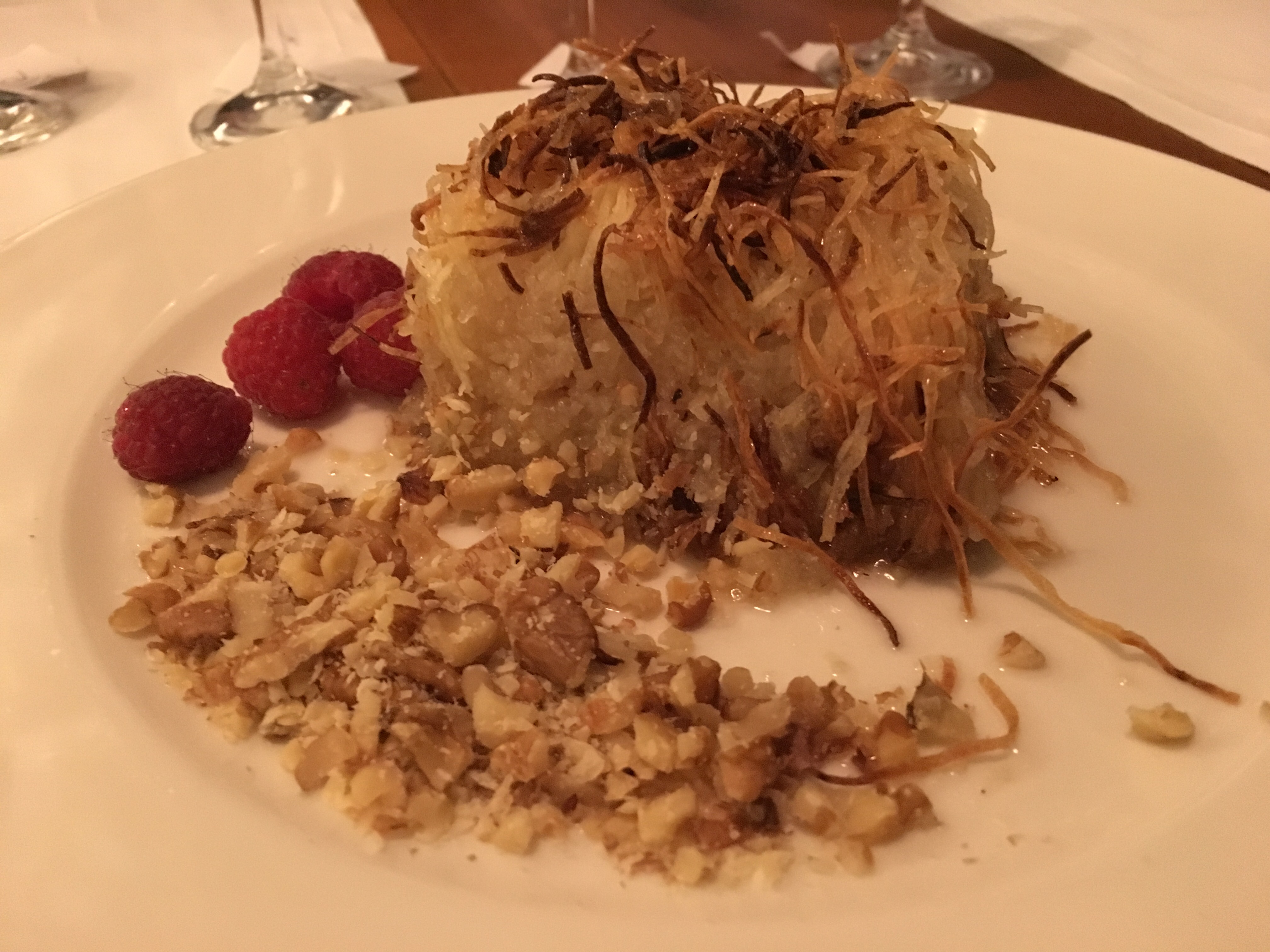 Finally, a little dessert (just one for the five of us). We had the Kadaif, a walnut and honey pastry. I had only one bite… I was so full! 😊