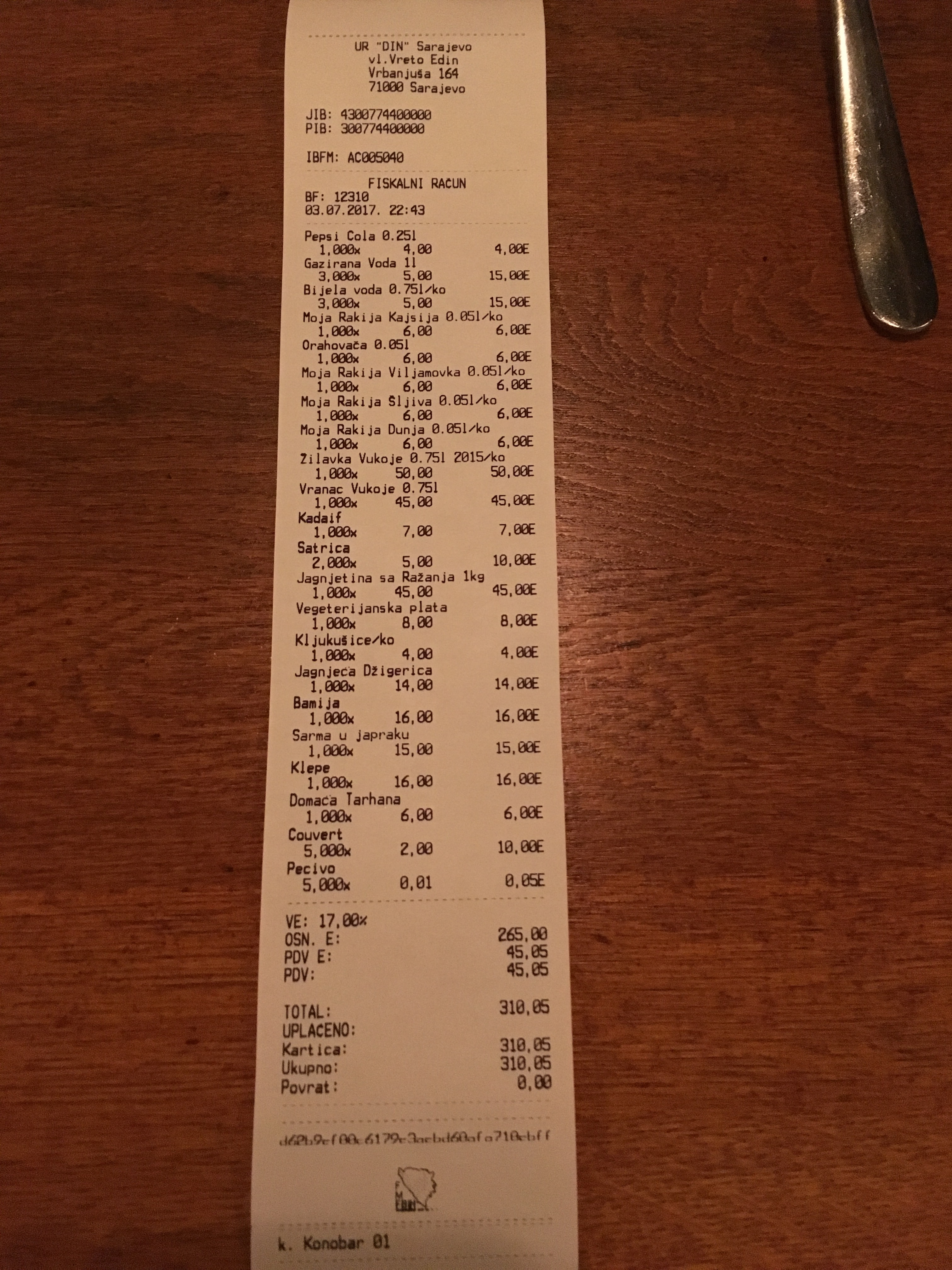 To finish our meal, we tried the restaurant’s full selection of Bosnian brandies and liquors. What a treat!!! From left to right- quince brandy, plum brandy, pear brandy, herb brandy, walnut liquor, and finally apricot brandy (my favorite). They were all unique, but not all delicious. The quince and plum were tough to swallow, basically fire water, but the rest were interesting and totally worth the low cost.